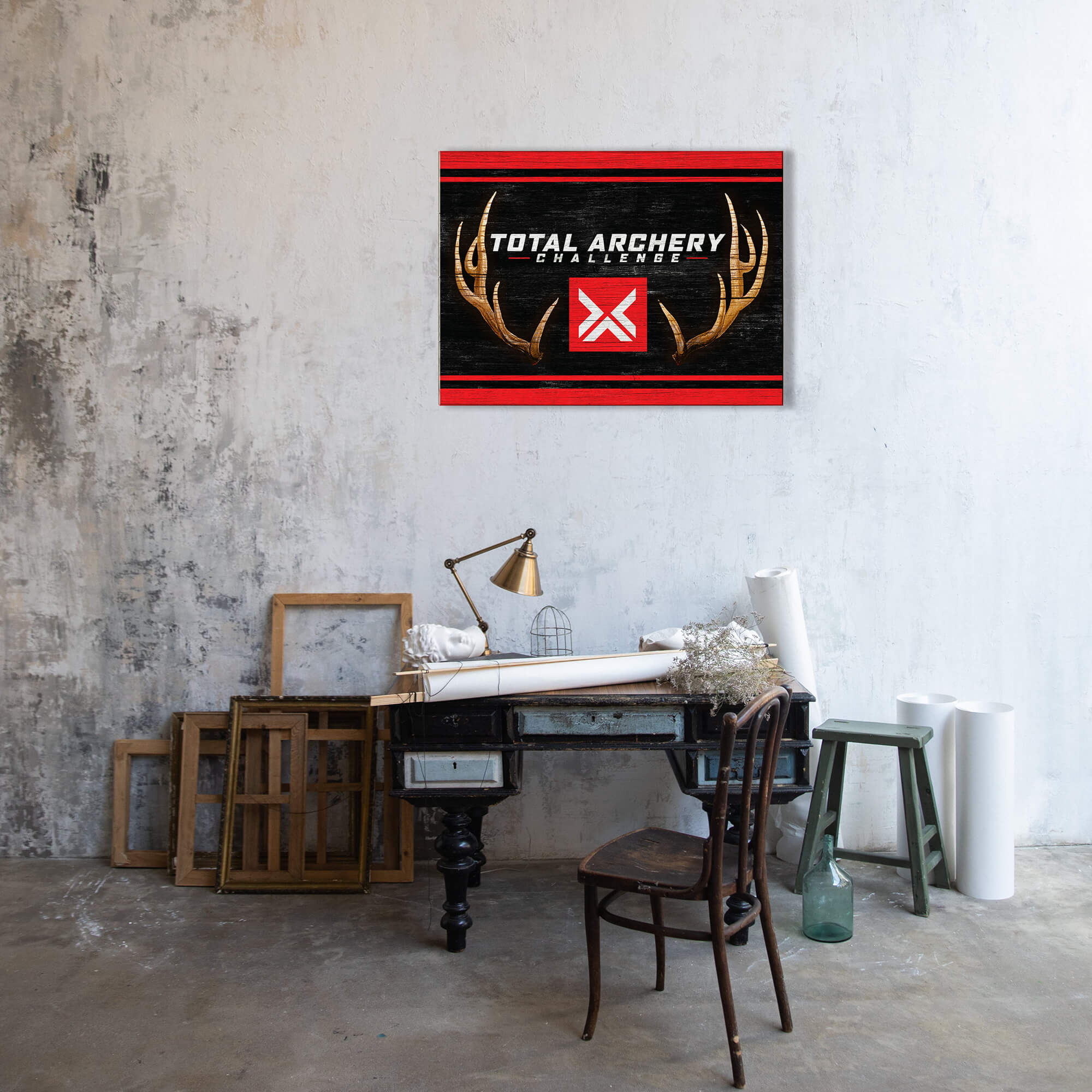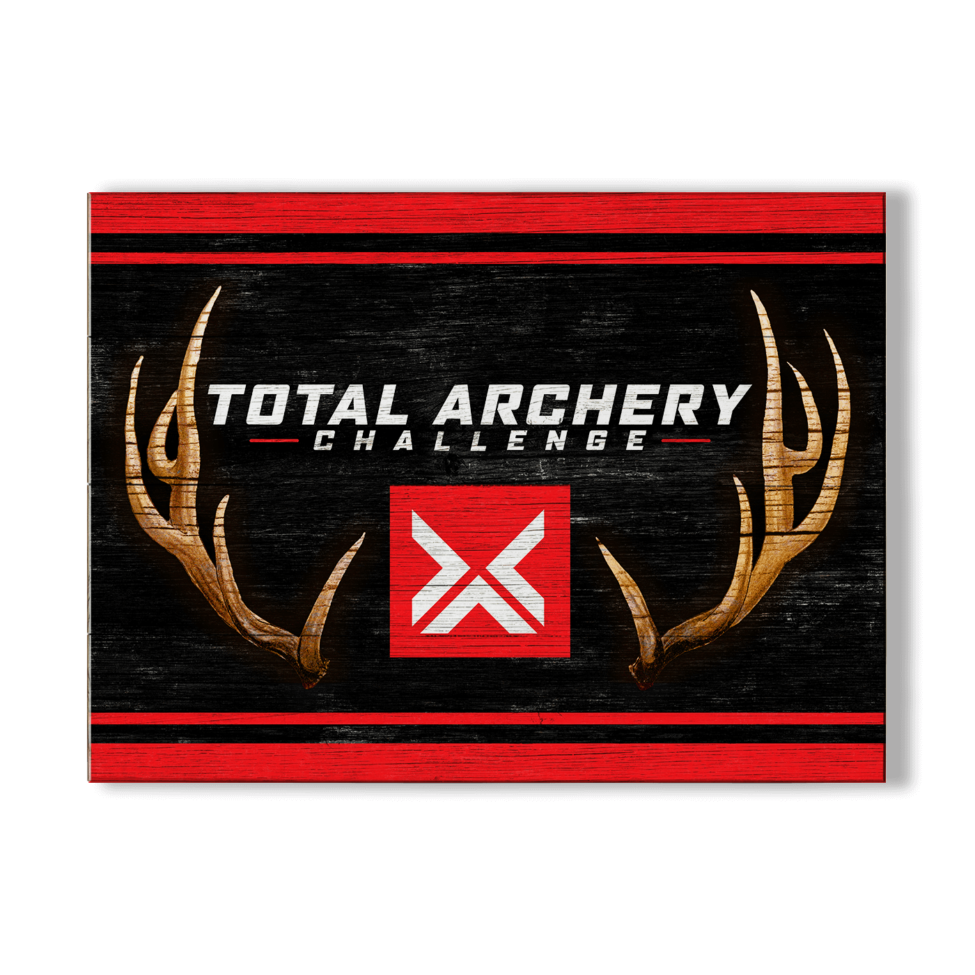 Show your passion for archery and the great outdoors with this bold Total Archery Challenge wall sign. Featuring the signature TAC logo flanked by a striking set of antlers on a rugged black woodgrain background with bold red accents, this piece embodies the spirit of the hunt and the challenge of the shot. It’s a perfect way to commemorate your TAC experience or inspire your next one. Ideal for archery ranges, gear rooms, man caves, or any space where adventure and precision are always welcome.