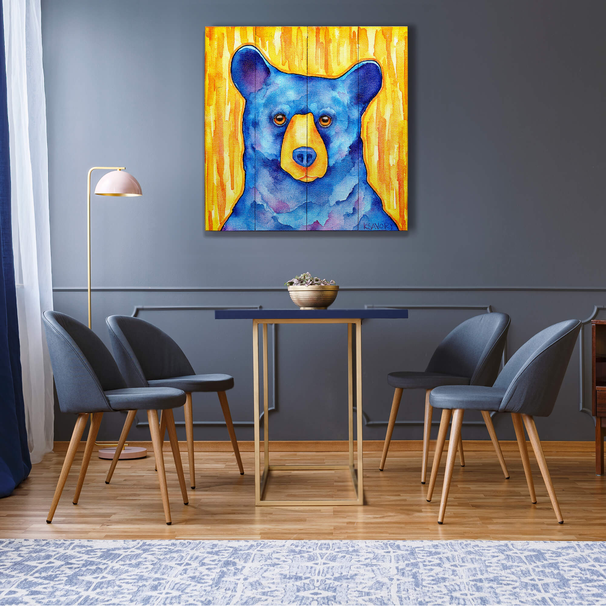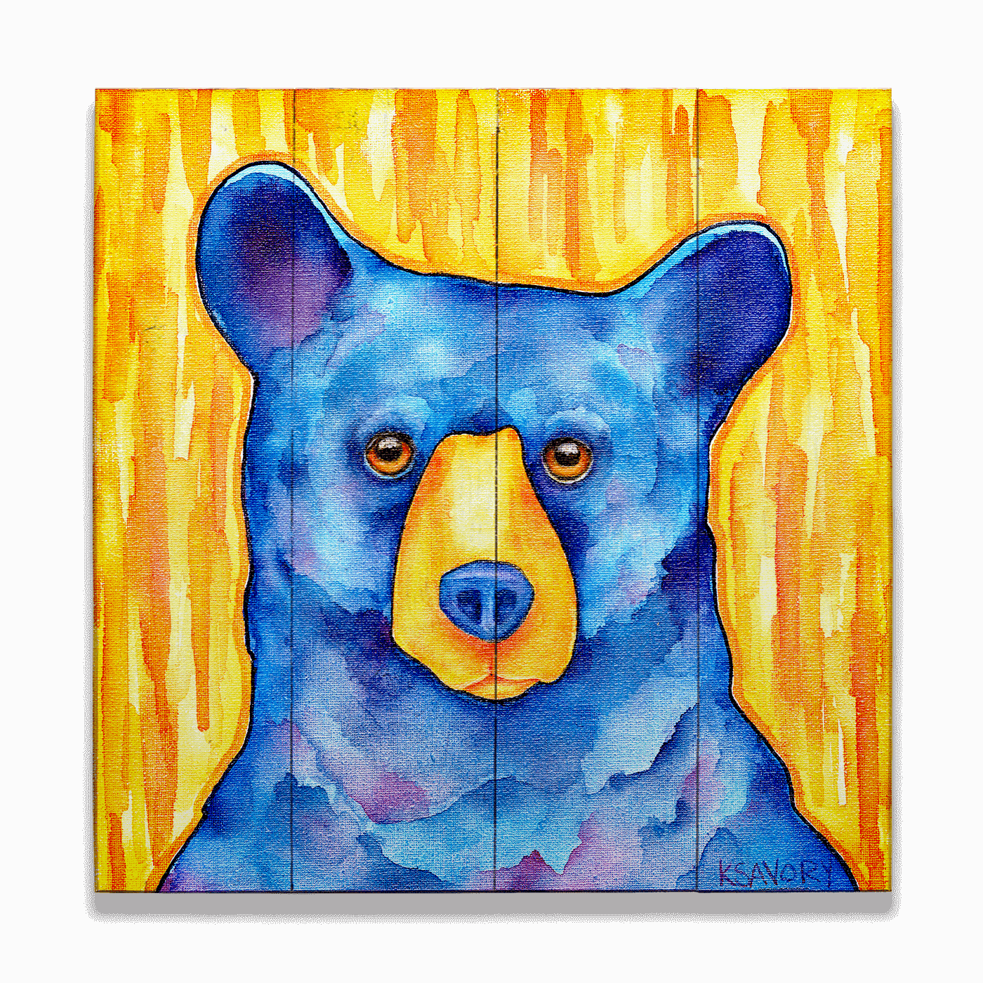 "Can't Buy Me Love" is an eye-catching artwork that features a vividly painted blue bear against a striking yellow backdrop. The bear’s soulful eyes and bold, expressive colors lend a unique and whimsical quality to this piece, blending playfulness with a hint of introspection. This artwork is perfect for those who seek to add a splash of color and a touch of heartfelt charm to their living space, making it an appealing choice for both contemporary and traditional settings.