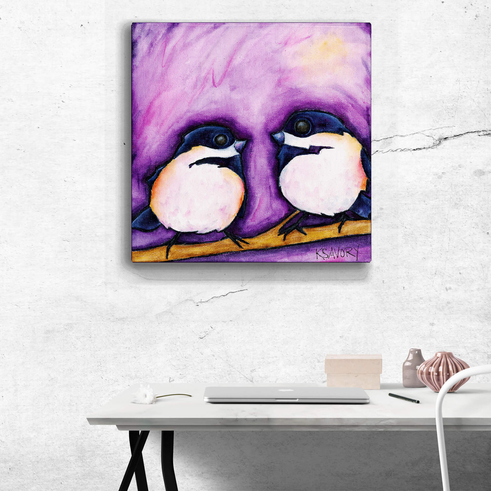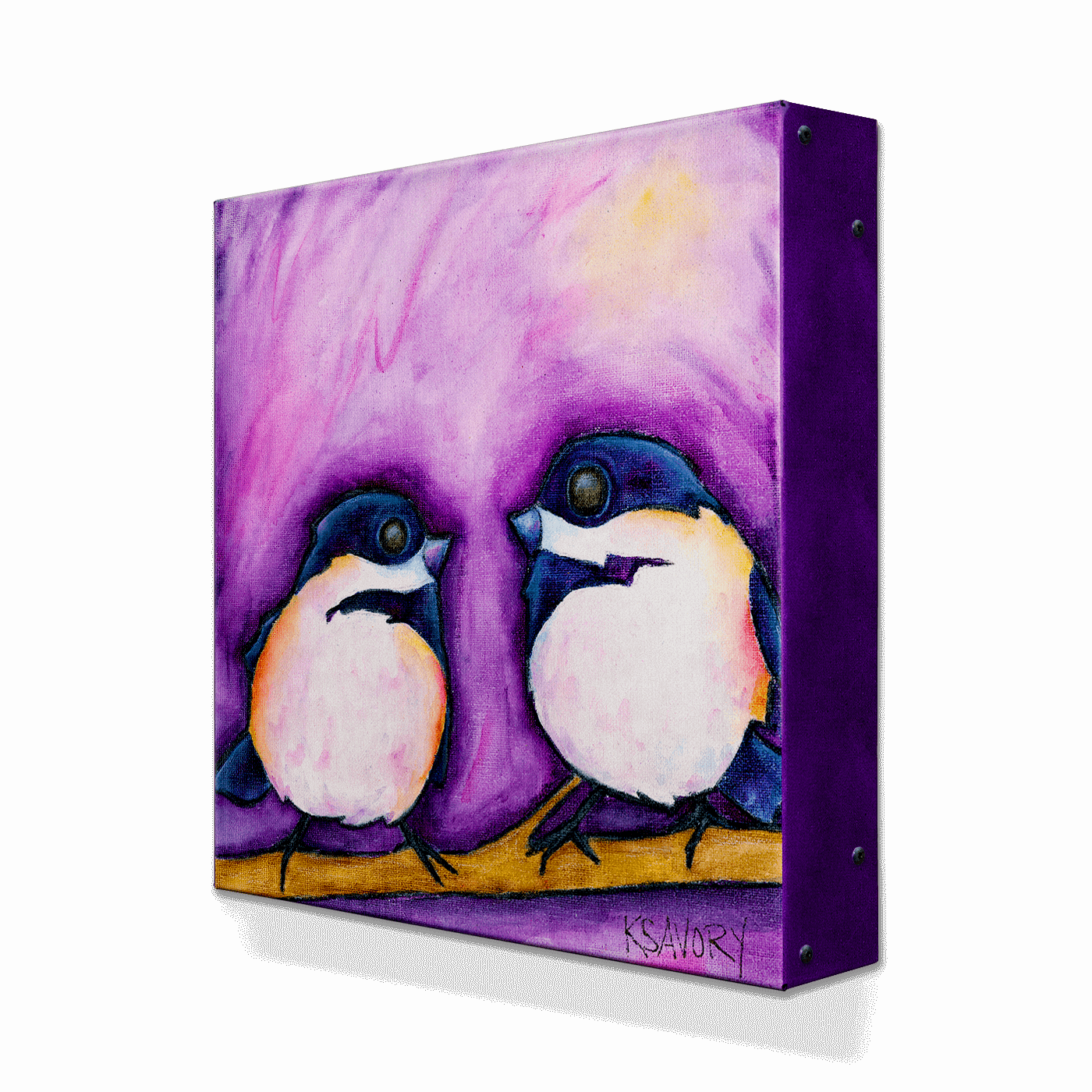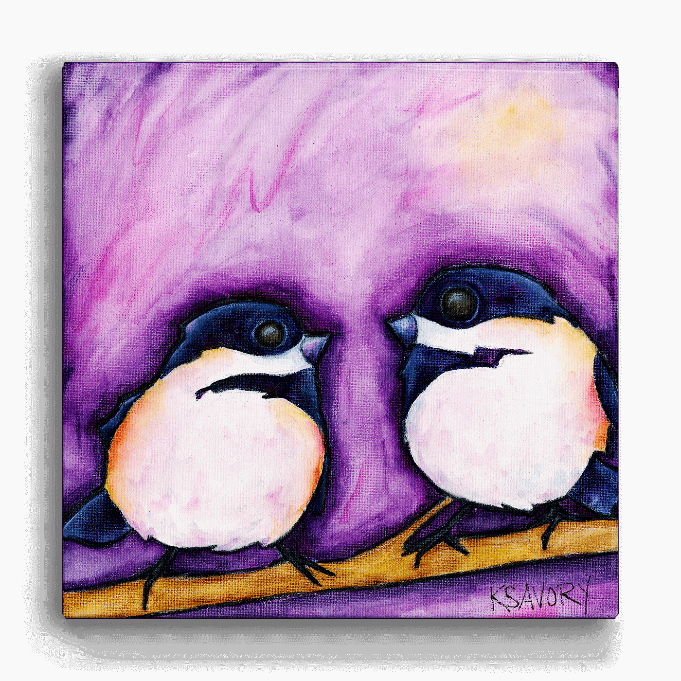 This charming artwork captures two adorable chickadees perched side by side, set against a soft purple background. The vibrant color palette and the endearing expressions of the birds create a warm, inviting atmosphere. This piece is perfect for bird lovers and art collectors who appreciate nature-inspired art with a whimsical touch. The simplicity and beauty of the composition make it a delightful addition to any room, adding a serene and cheerful vibe.