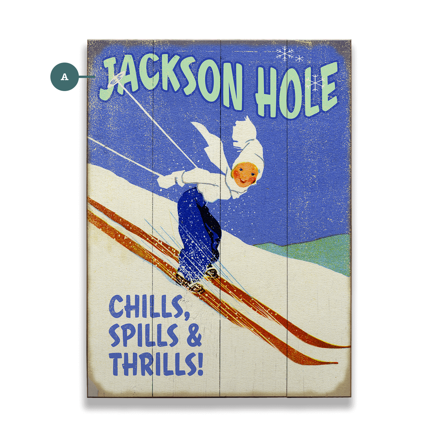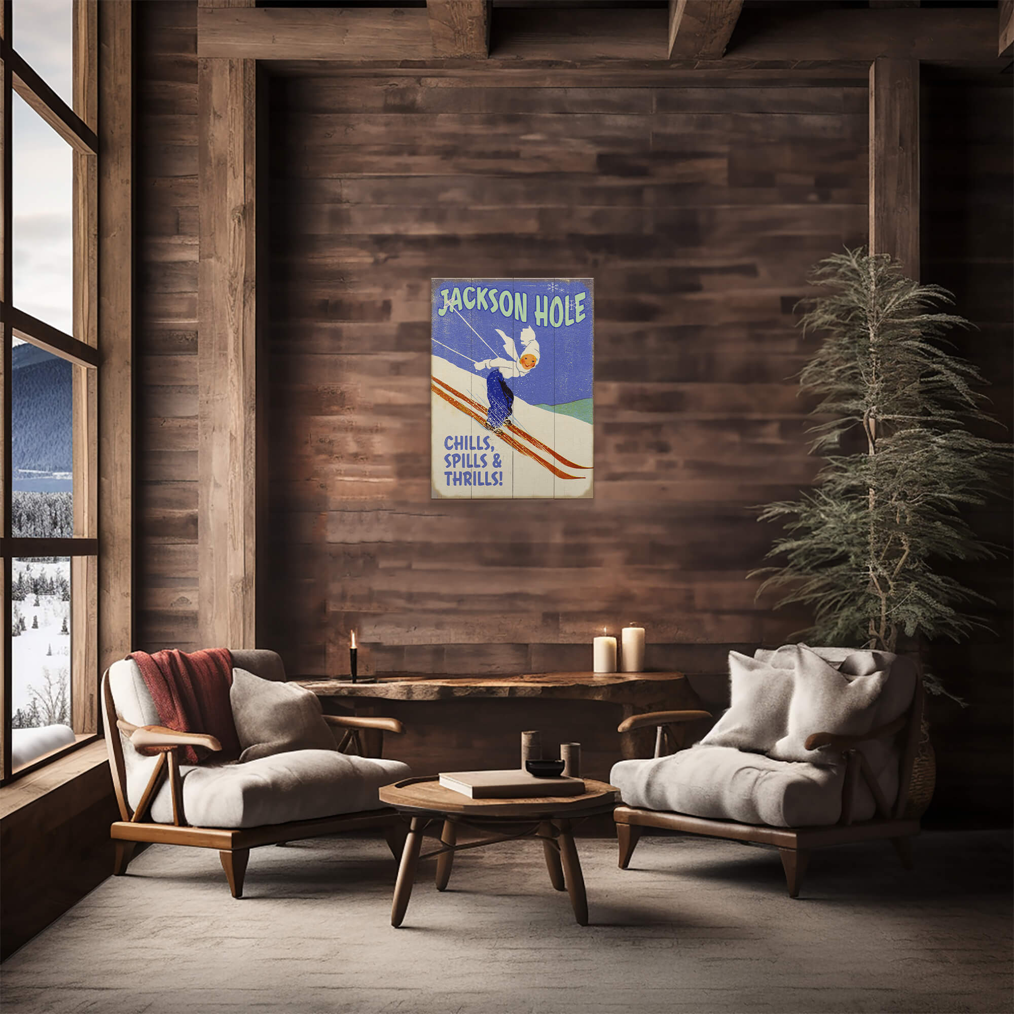 This lively artwork captures the excitement of skiing with bold energy. A skier in mid-action speeds downhill through fresh snow, their dynamic pose and cheerful expression embodying the fun and daring of winter sports. The vivid blue sky, crisp white slopes, and playful lettering bring a sense of adventure to life, while the tagline “Chills, Spills & Thrills!” adds a lighthearted touch. A perfect celebration of snowy escapades and the joy of embracing winter’s challenges.