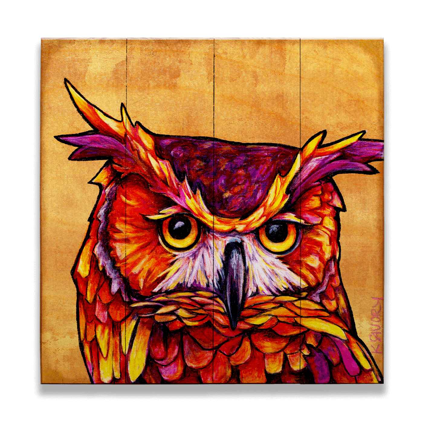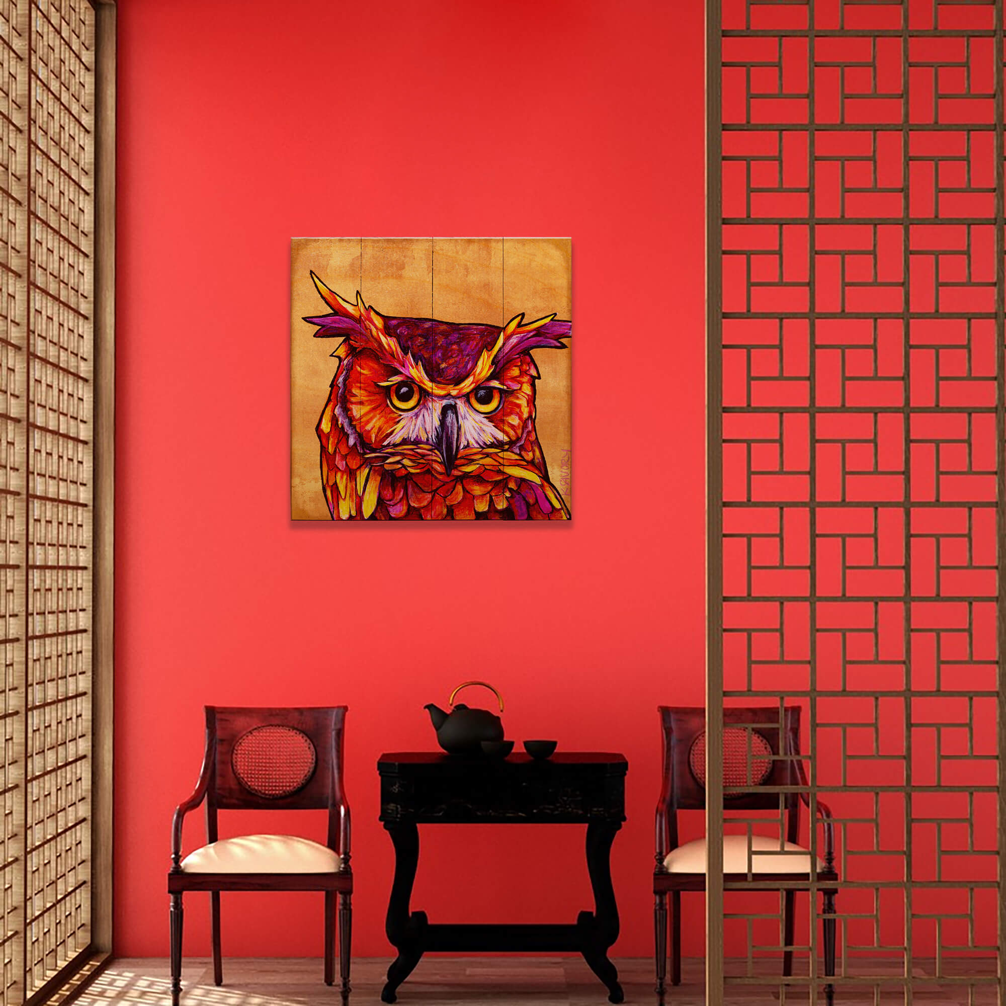 This vibrant owl artwork captures the essence of wisdom and mystery with striking, fiery colors and a bold, expressive design. Set against a warm background, the intense, penetrating gaze draws viewers in, giving the owl a majestic and powerful presence. Perfect for art enthusiasts who appreciate wildlife and nature-inspired designs, this piece combines bold colors with intricate details, making it a standout addition to any room or space seeking a splash of color and character.