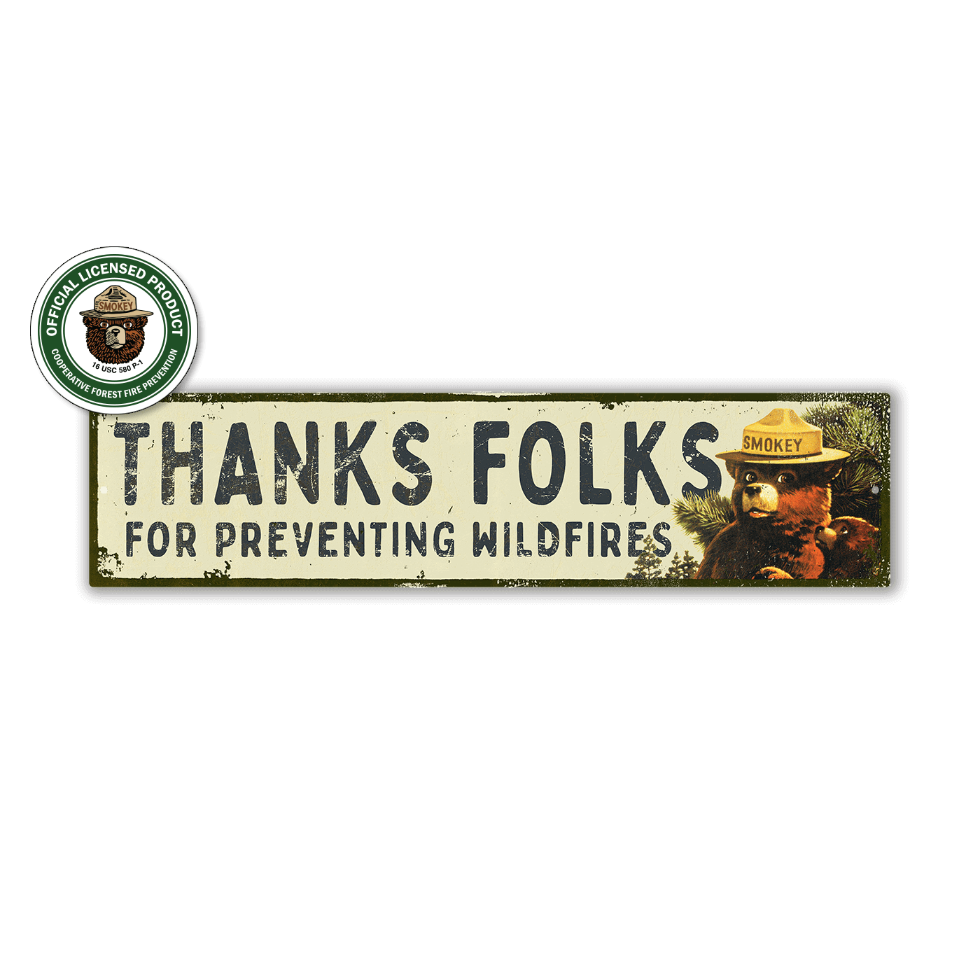 This classic Smokey Bear artwork delivers an enduring message of wildfire prevention. Smokey stands beside a young bear cub among the trees, with a “Thanks Folks” sign reminding visitors to do their part in keeping forests safe. The scene captures a moment of shared responsibility between generations and offers a nostalgic nod to outdoor stewardship. A fitting piece for cabins, lodges, parks, or any space that celebrates the importance of protecting the great outdoors.