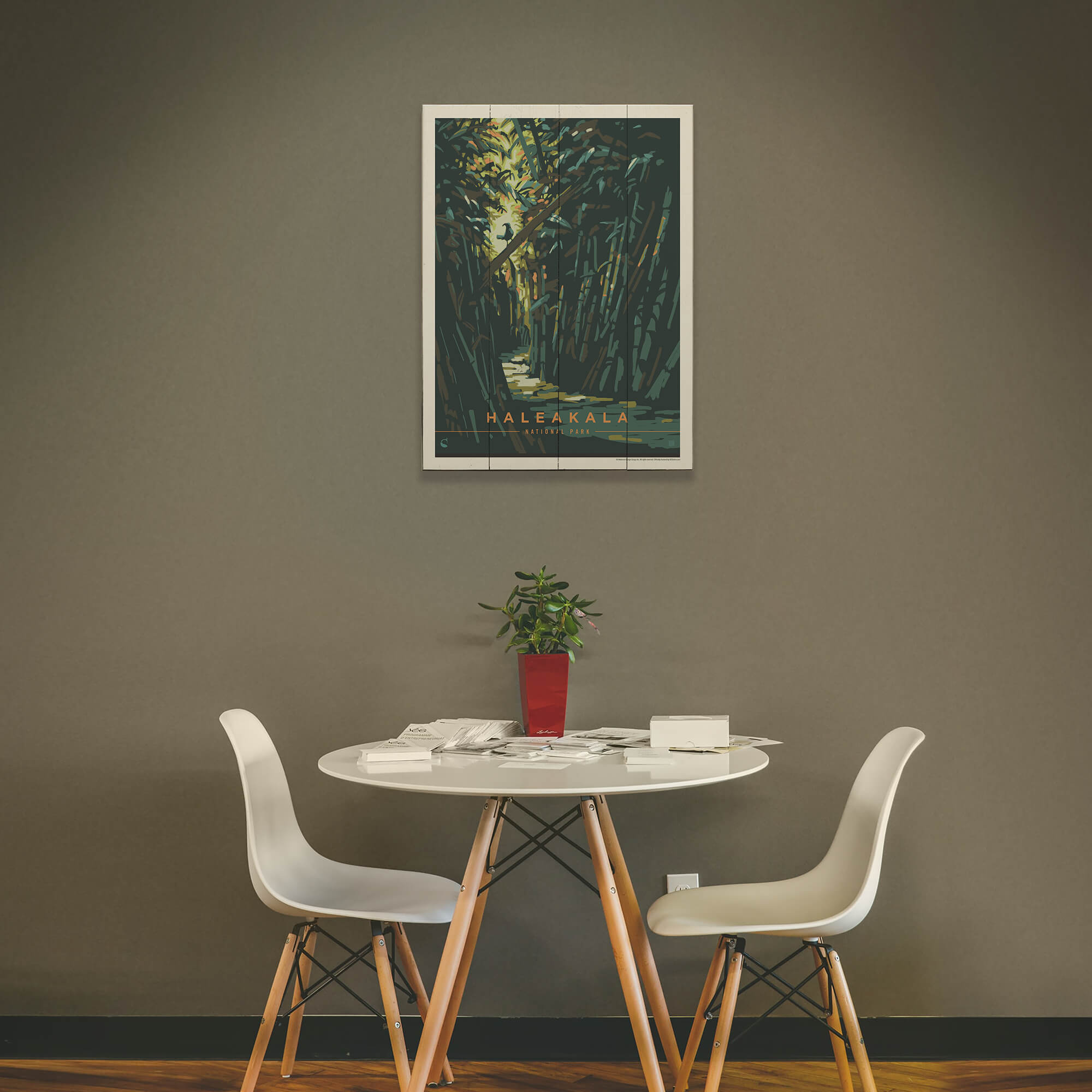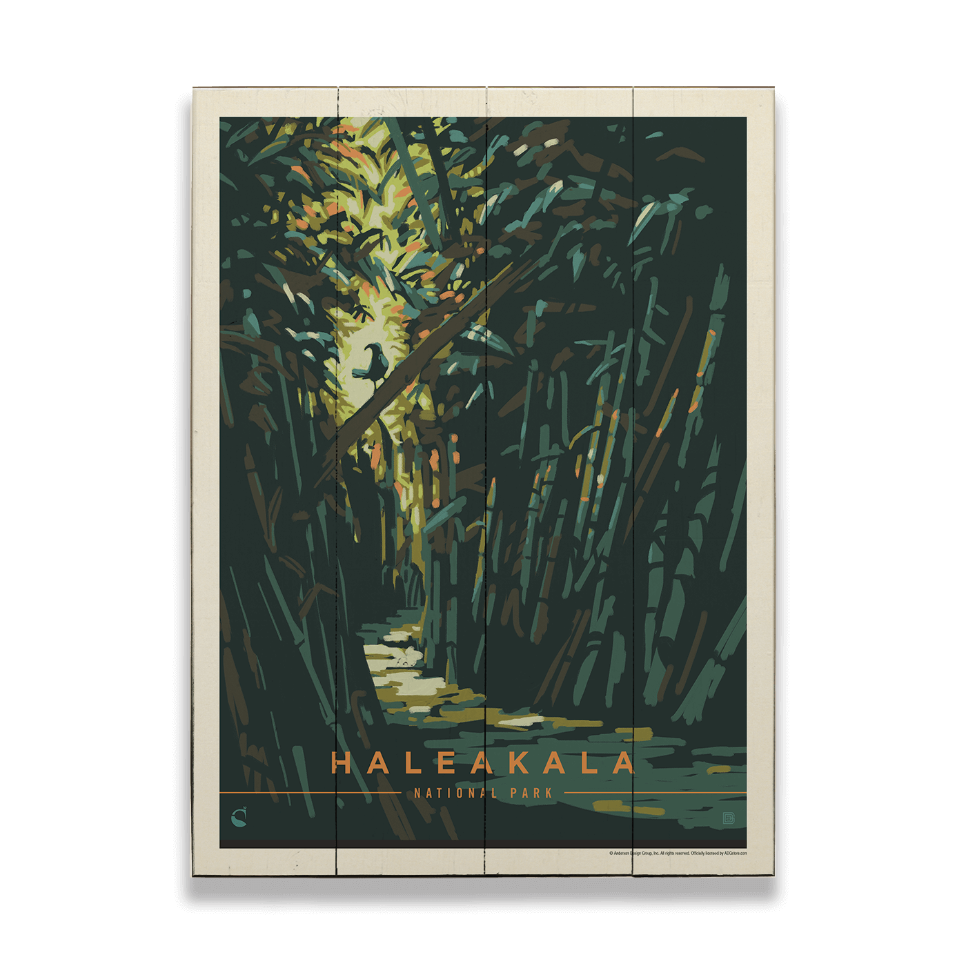 Immerse yourself in the tropical depths of Haleakalā National Park with this richly detailed forest scene. A winding trail leads through dense bamboo groves and towering trees, where golden sunlight breaks through the canopy in scattered beams. A native bird rests on a branch, evoking the park’s role as a sanctuary for rare and endangered species. This artwork highlights the park’s quieter side—far from the volcanic summit, where lush foliage, filtered light, and birdsong create a world of calm and wonder.