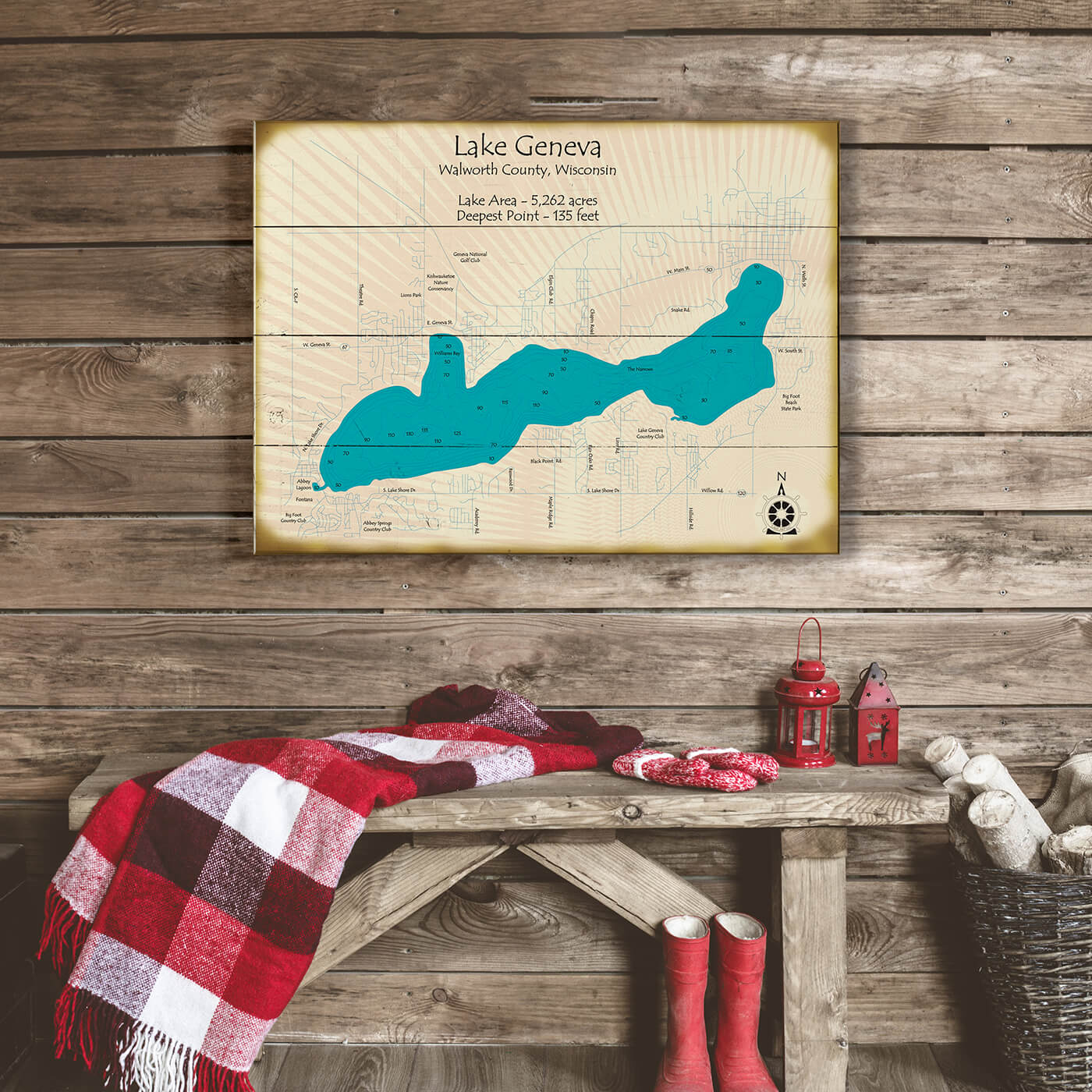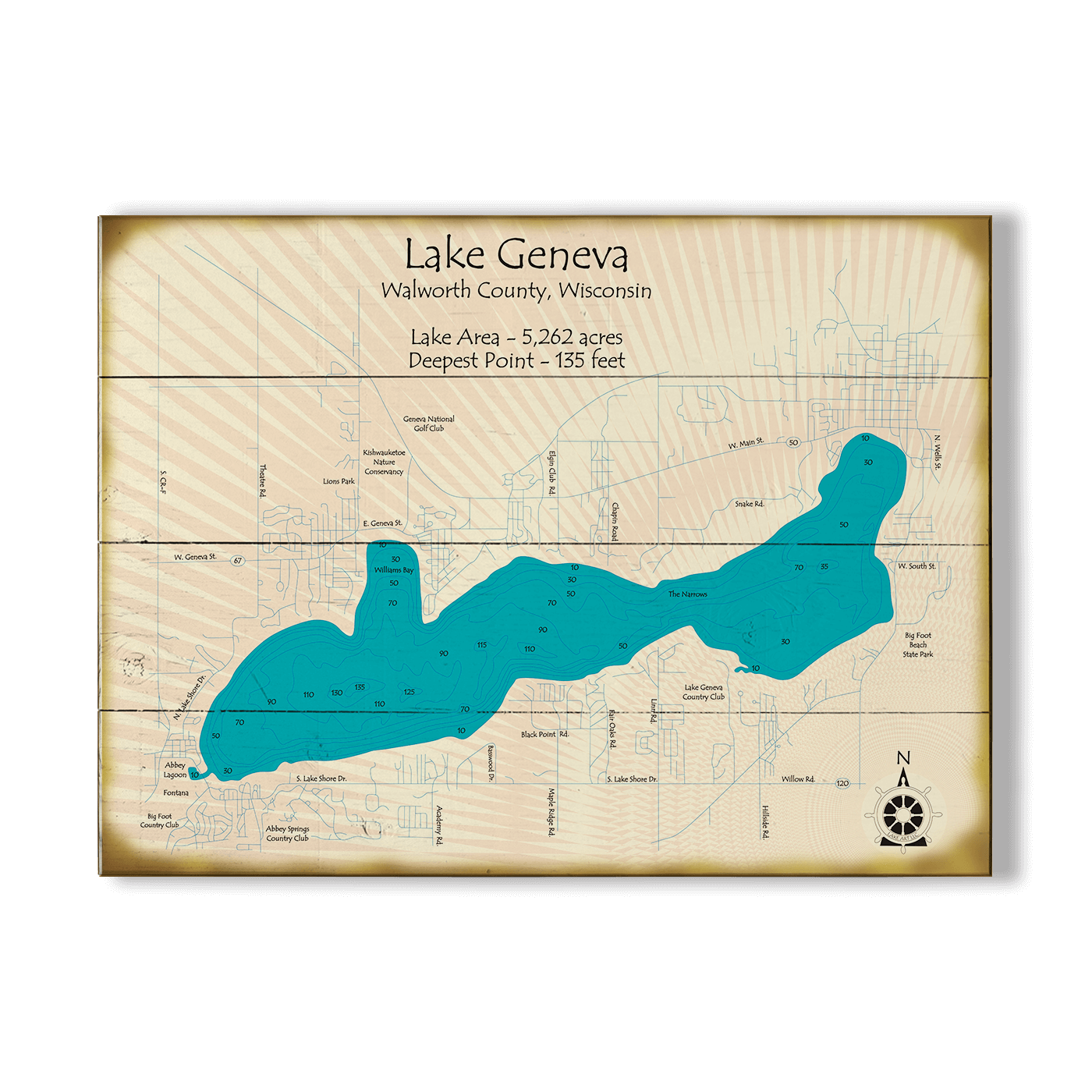 Celebrate the iconic charm of Lake Geneva, located in Walworth County, Wisconsin, with this beautifully detailed map featuring the lake’s smooth contours, surrounding streets, and notable shoreline landmarks. Spanning 5,262 acres with a maximum depth of 135 feet, Lake Geneva has long been a favorite Midwest retreat for boating, water sports, lakeside dining, and summer escapes. From elegant estates and public beaches to scenic walking paths and historic charm, the lake offers a rich blend of recreation and relaxation. Whether you're a longtime visitor or simply drawn to its reputation as a premier lake town, this artwork is a timeless way to commemorate the beauty and spirit of Lake Geneva.