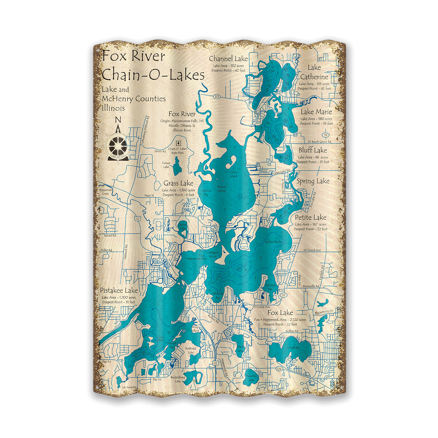 Bring the beauty of northern Illinois to your wall with this Fox River Chain-O-Lakes map art. This vintage-style map of the Fox River Chain-O-Lakes highlights the scenic waterways that connect Channel Lake, Pistakee Lake, Fox Lake, and Grass Lake, spanning Lake and McHenry Counties.
