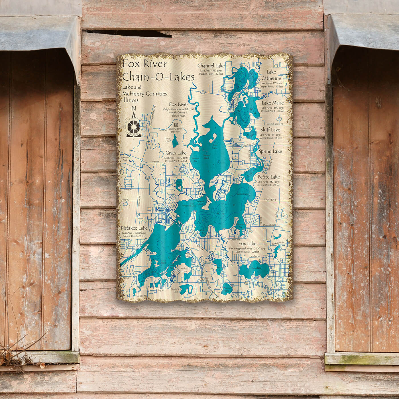 Perfect for a lake house, cabin, or boating enthusiast’s home décor, this Illinois lake map celebrates the winding beauty of the Fox River and its connected lakes in timeless style.