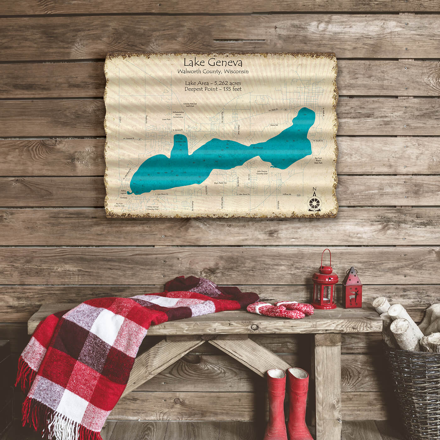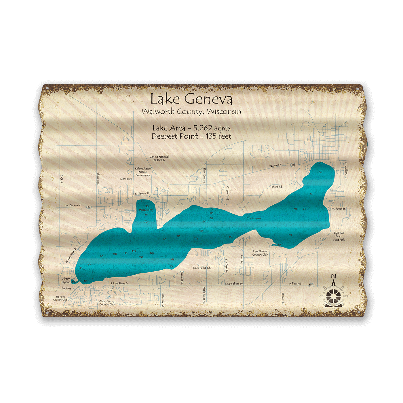 Celebrate the iconic charm of Lake Geneva, located in Walworth County, Wisconsin, with this beautifully detailed map featuring the lake’s smooth contours, surrounding streets, and notable shoreline landmarks. Spanning 5,262 acres with a maximum depth of 135 feet, Lake Geneva has long been a favorite Midwest retreat for boating, water sports, lakeside dining, and summer escapes. From elegant estates and public beaches to scenic walking paths and historic charm, the lake offers a rich blend of recreation and relaxation. Whether you're a longtime visitor or simply drawn to its reputation as a premier lake town, this artwork is a timeless way to commemorate the beauty and spirit of Lake Geneva.