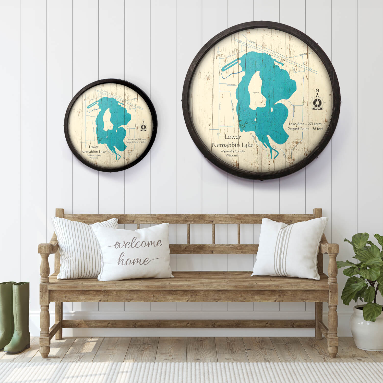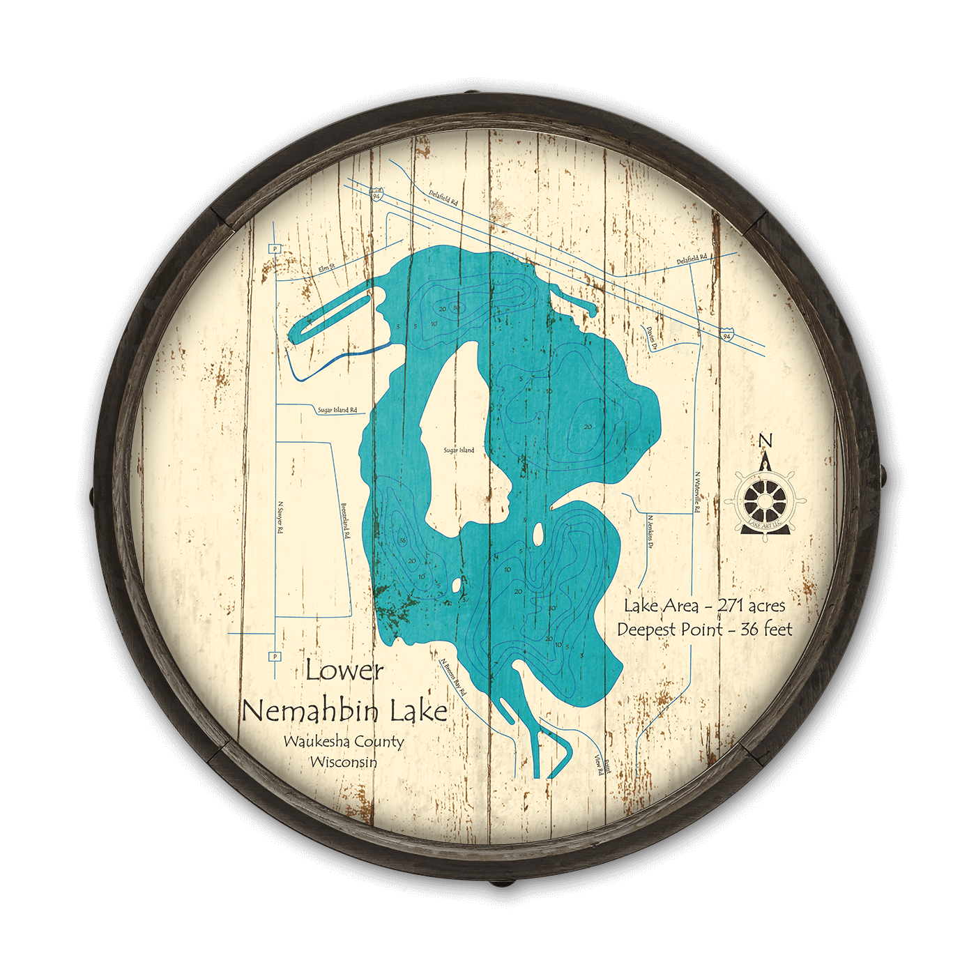 This elegant lake map showcases Lower Nemahbin Lake with crisp bathymetric contours, shoreline details, and surrounding roads arranged in a clean vintage-inspired layout. The warm color scheme and compass rose accent give it a nostalgic charm. Ideal for anyone who fishes, boats, or spends summers along the water, this artwork brings a piece of Waukesha County’s natural beauty into your home, cabin, or lakeside retreat.