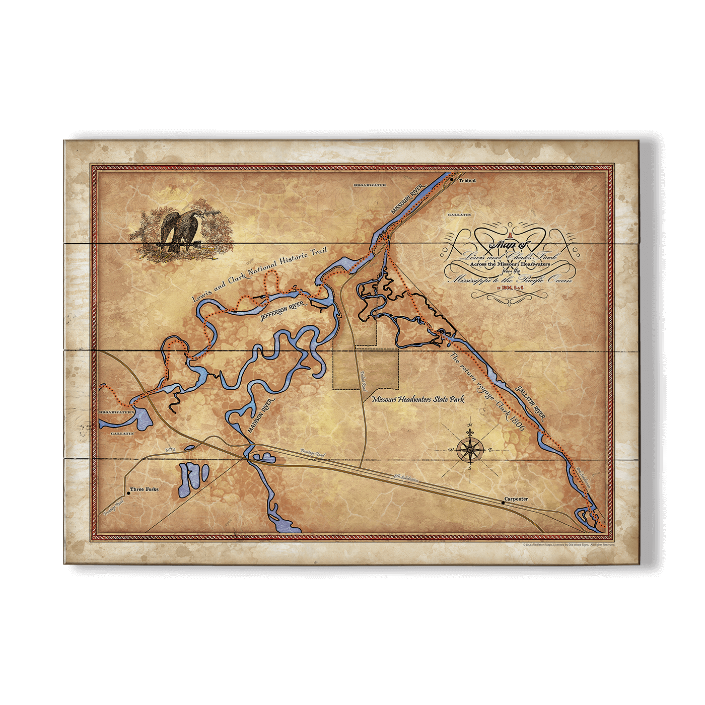 Explore the storied confluence where the Jefferson, Madison, and Gallatin rivers meet to form the majestic Missouri River at Missouri Headwaters State Park in Montana. This hand-painted, historic map captures the essence of exploration with its rich, vintage aesthetic. Highlighting notable features such as the Lewis and Clark National Historic Trail winding through the park, this artwork is a treasure for both history buffs and cartography enthusiasts. Adorn your space with this map to celebrate the early days of American exploration and the natural beauty of Montana's river landscapes.