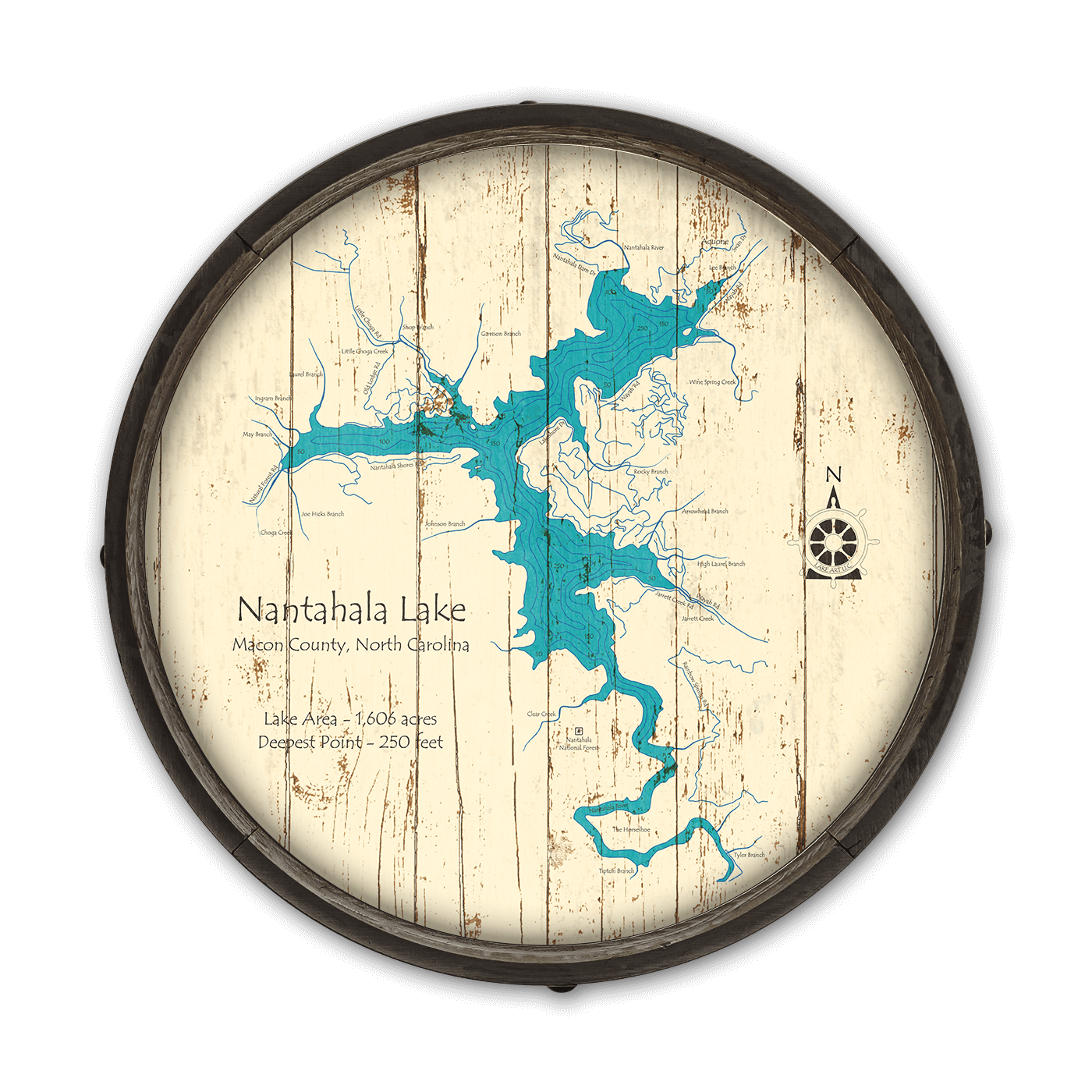 Showcasing the dramatic contours of Nantahala Lake in Macon County, North Carolina, this detailed map captures the lake’s winding arms, feeder creeks, and surrounding roadways. Spanning 1,606 acres with an impressive depth of 250 feet, Nantahala Lake is a high-elevation reservoir known for its crystal-clear waters, tranquil surroundings, and exceptional fishing. Surrounded by the Nantahala National Forest, this secluded lake offers a peaceful retreat for boating, kayaking, and nature exploration. Whether you're drawn to its cool mountain air or the quiet beauty of its coves and inlets, this artwork is a striking tribute to one of western North Carolina’s hidden gems.