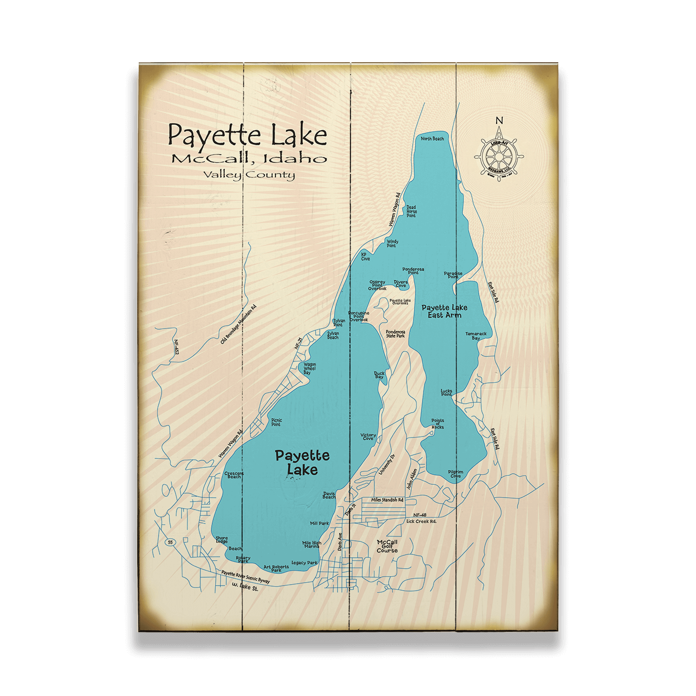 Celebrate the inviting beauty of Payette Lake in McCall, Idaho, with this detailed artwork highlighting its clear waters, East Arm, surrounding roads, and nearby landmarks. Nestled in Valley County, Payette Lake is beloved for its mountain views, cool alpine waters, and endless opportunities for boating, fishing, swimming, and lakeside relaxation. With its charming town of McCall on the southern shore, the lake is a year-round destination for recreation and getaway retreats. Whether you remember crisp summer mornings on the dock or peaceful paddles across glassy water, this piece offers a meaningful way to honor your connection to one of Idaho’s most treasured lakes.