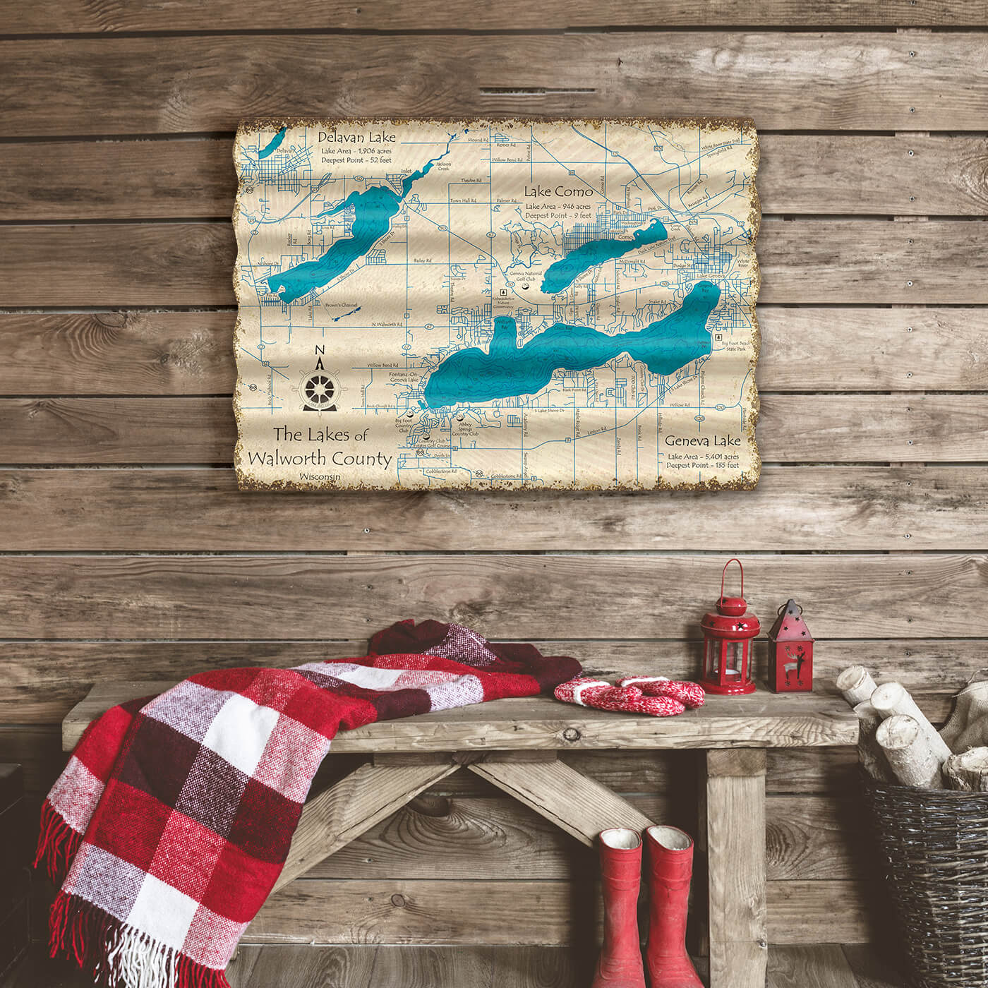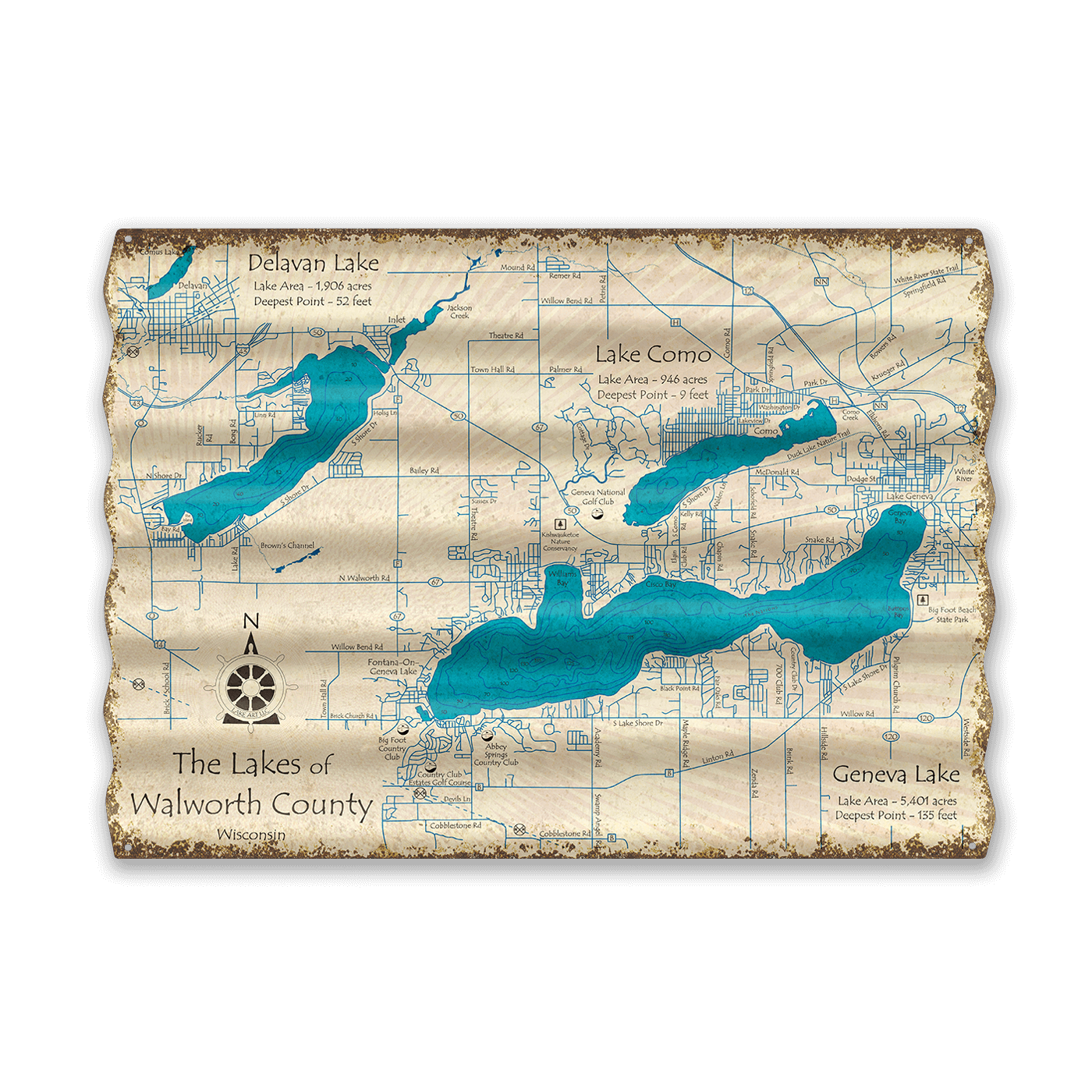 Explore the captivating lakes of Walworth County, Wisconsin with this beautifully detailed, vintage-style map. Featuring Delavan Lake, Lake Como, and Geneva Lake, this artwork is a must-have for any cartography enthusiast or local history buff. Each lake is meticulously illustrated with depth contours and key landmarks, set against a rustic background that evokes the rich heritage of the region. Perfect for home decor or as a thoughtful gift, this map not only celebrates Wisconsin's natural beauty but also serves as a practical reference for adventurers and residents alike.