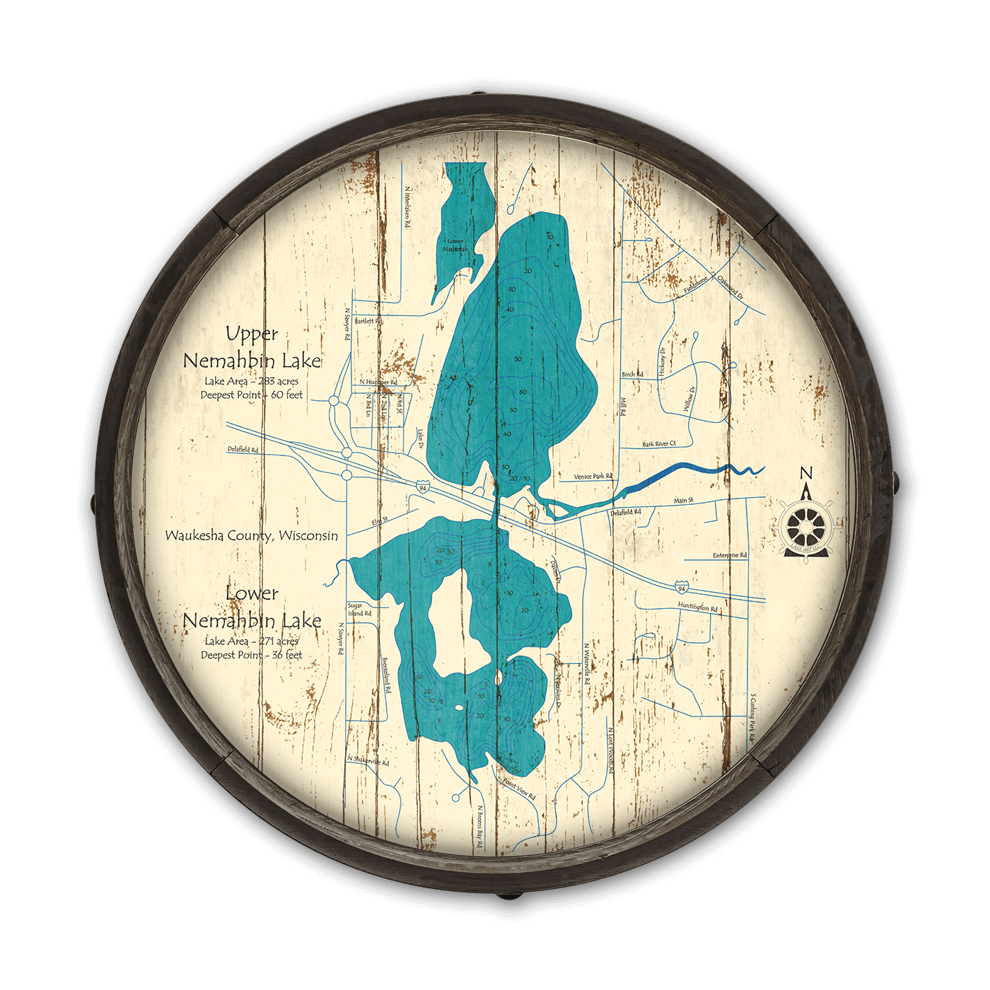 Explore the scenic waterways of Waukesha County with this detailed map of Upper and Lower Nemahbin Lake. Styled in a warm vintage palette, the artwork highlights shoreline features, depth contours, local roads, and the natural flow between the two connected basins. The clean cartographic design brings clarity to the lake’s shape and structure, while the distressed edges give the piece a timeless, classic feel. Perfect for lake houses, cabins, and anyone who enjoys boating, paddling, fishing, or summers in Wisconsin’s lake country, this map makes a beautiful tribute to a favorite place on the water.