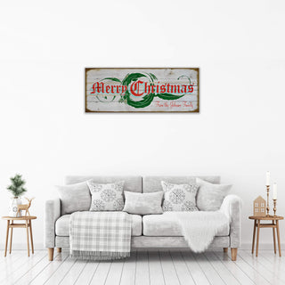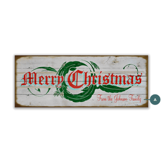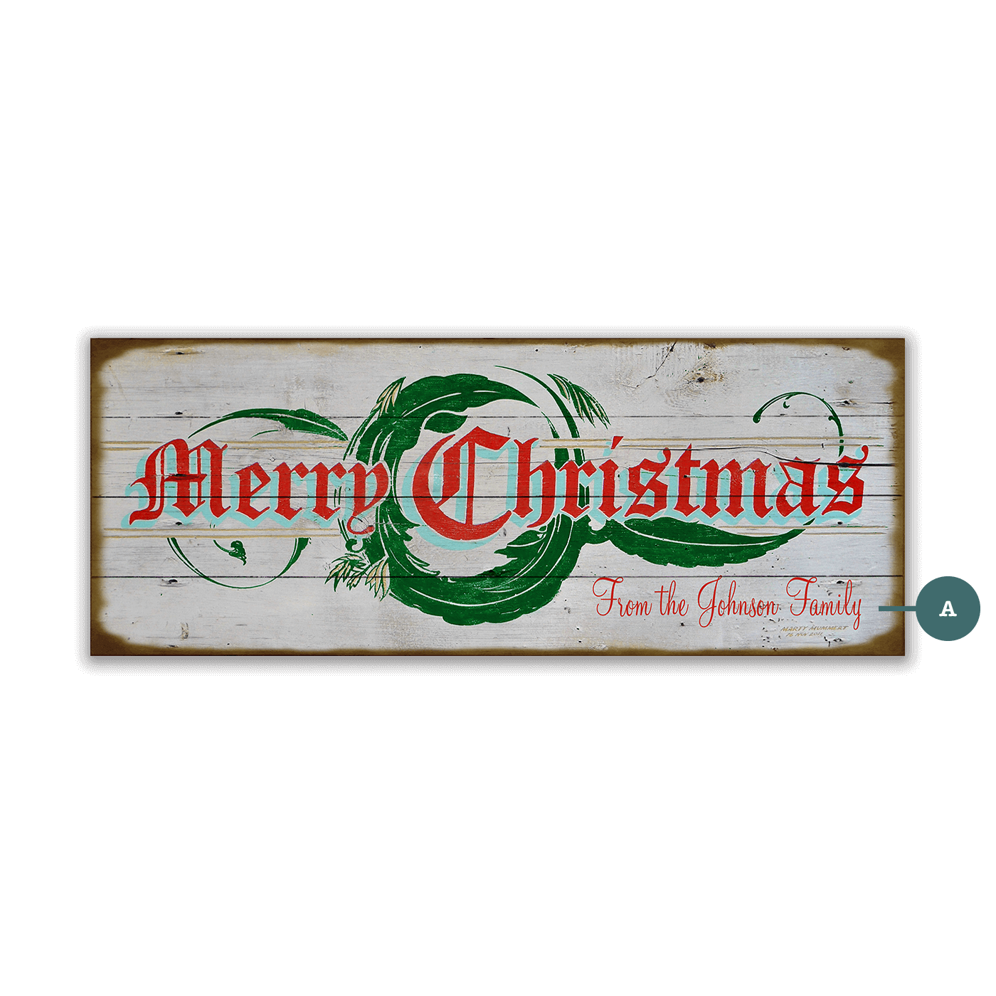 Infuse your holiday decor with a personal touch using our customizable "Merry Christmas" sign. This festive artwork features an elegant wreath of green, intertwined with the classic hand-lettered holiday greeting in bold, sweeping red letters. The customizable area, denoted by point 'A', allows for a family name or a special message, making it an ideal addition to your seasonal decorations or a heartfelt gift. Hang it above your mantle, at your front door, or in any space where you want to spread Christmas cheer and a sense of warm, personalized holiday spirit.