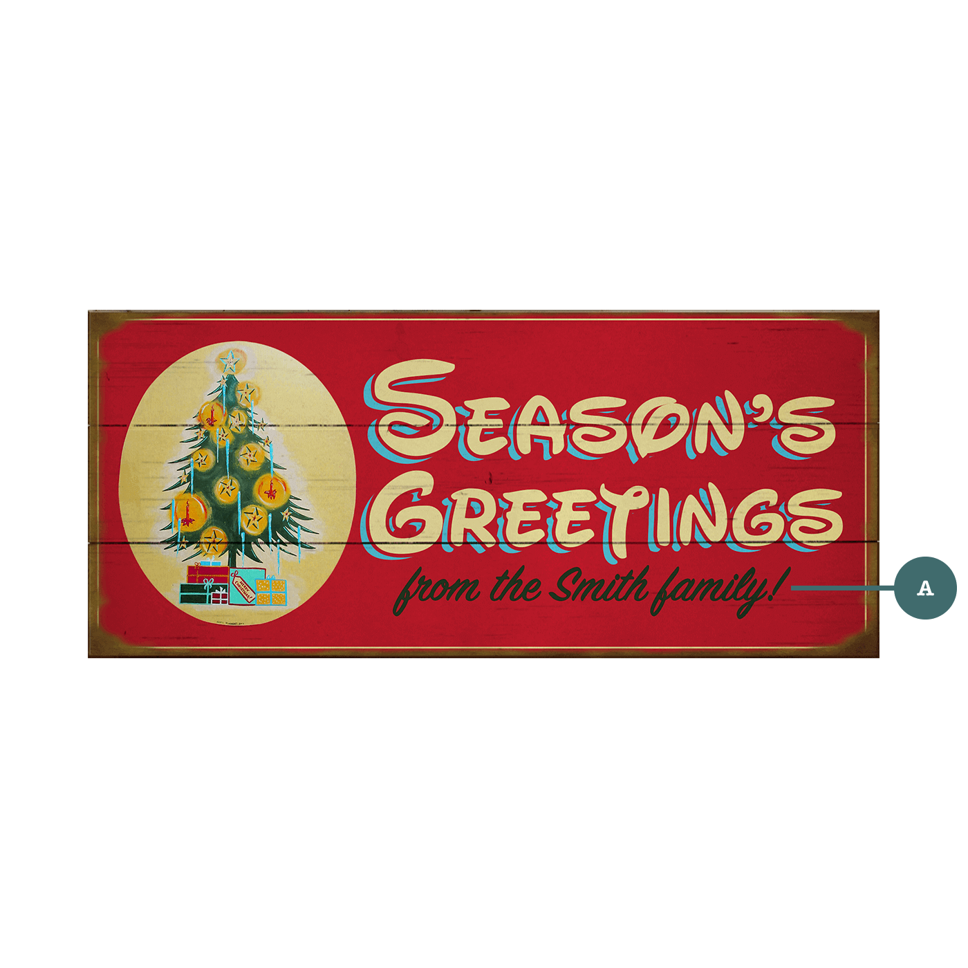 Celebrate the festive season with Marty Mummert's hand-lettered "Season's Greetings" sign, a charming addition to any holiday decor. This beautifully crafted piece features an elegantly decorated Christmas tree, set against a rustic backdrop that gives a nostalgic nod to holiday traditions. The customizable area, marked by point 'A', allows you to tailor the sign with your family name, making it a perfect personalized touch for your home or as a thoughtful gift. It's a wonderful way to express your holiday wishes and share the joy of the season with friends, family, and guests.