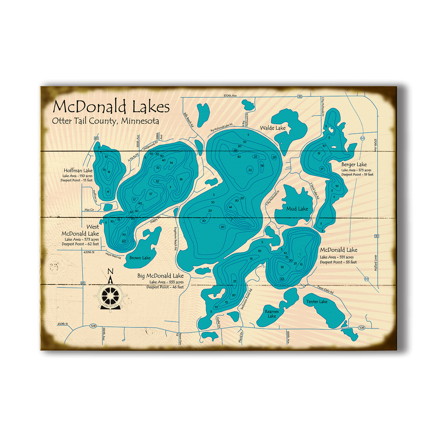 Experience the stunning beauty of Minnesota's McDonald Lakes in a whole new way with this exquisite vintage-style map. Nestled in the heart of the beautiful north woods of Minnesota, McDonald Lakes offer endless opportunities for outdoor recreation and relaxation. Whether you're into water sports along the pristine shoreline, or simply soaking up the sun on the sandy beaches, there's something for everyone to enjoy on these scenic lakes.