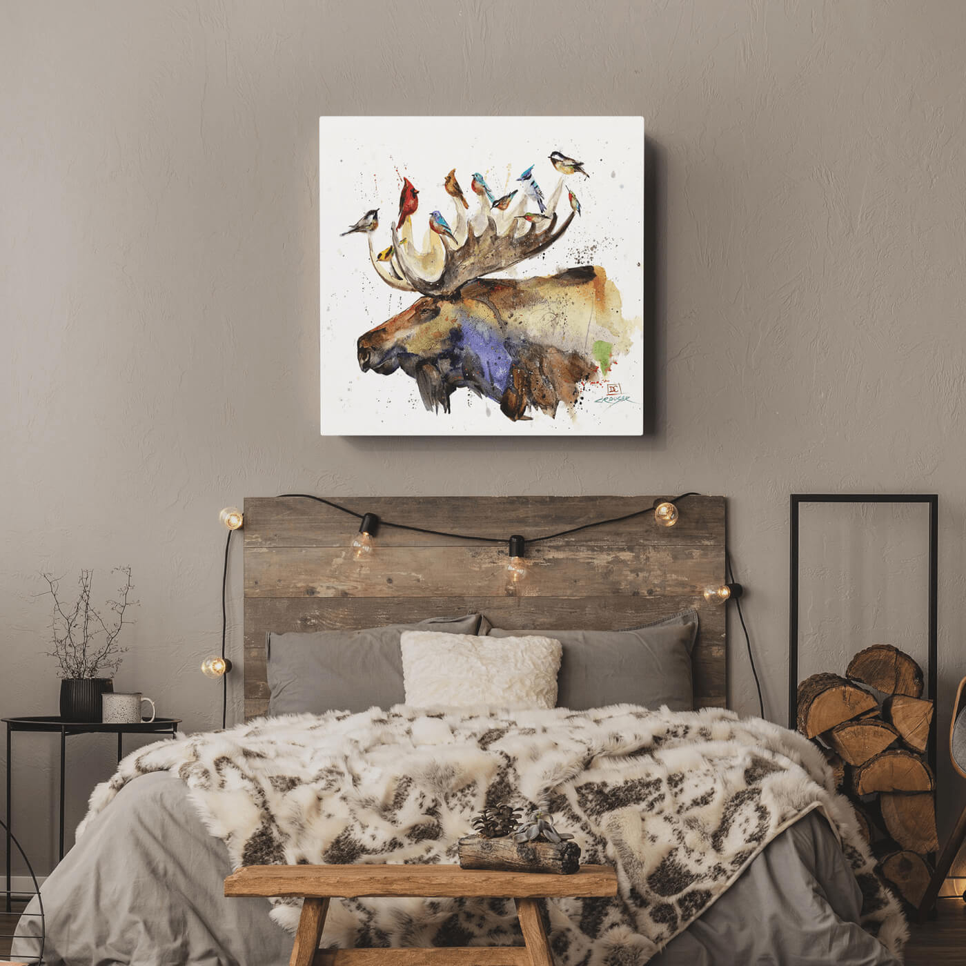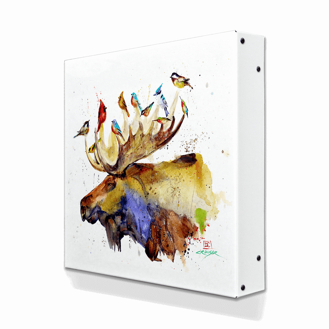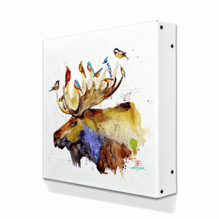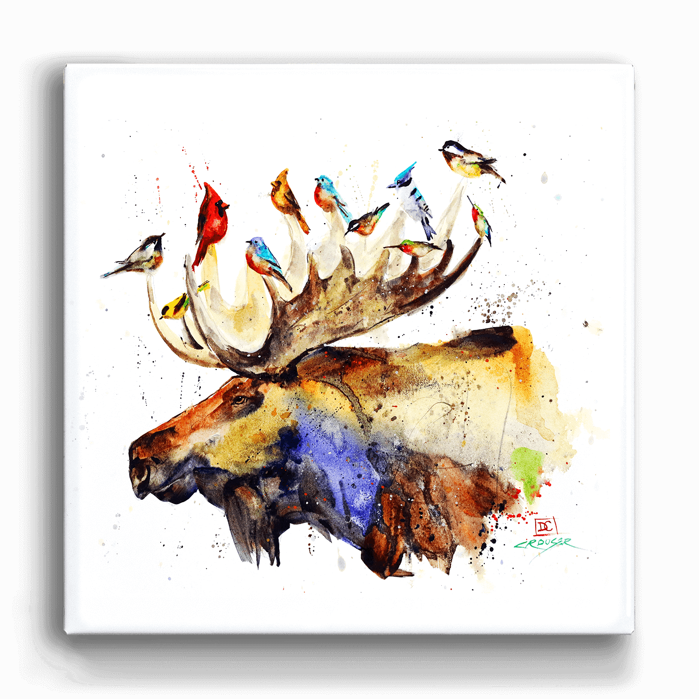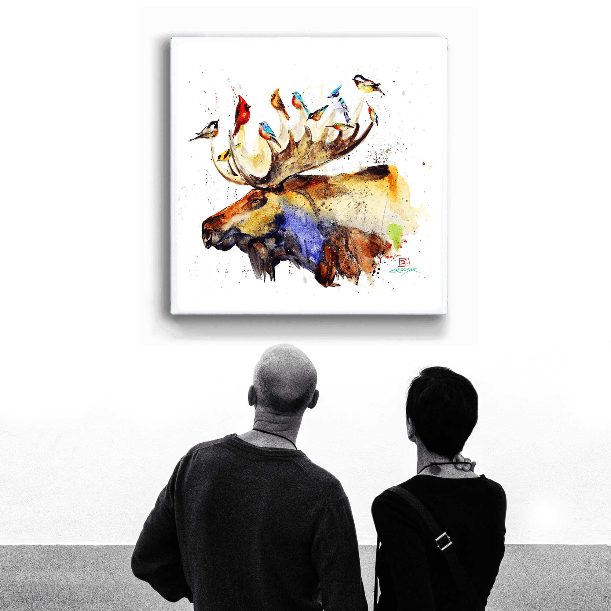 Celebrate the splendor of wildlife with this enchanting watercolor painting, featuring a majestic moose adorned with a colorful array of birds perched on its antlers. The artwork beautifully blends the rustic charm of the moose with the vibrant energy of the birds, creating a whimsical and harmonious scene. Ideal for both contemporary and rustic decor, this painting will captivate and charm anyone who views it, adding a touch of nature’s playful spirit to your home.
