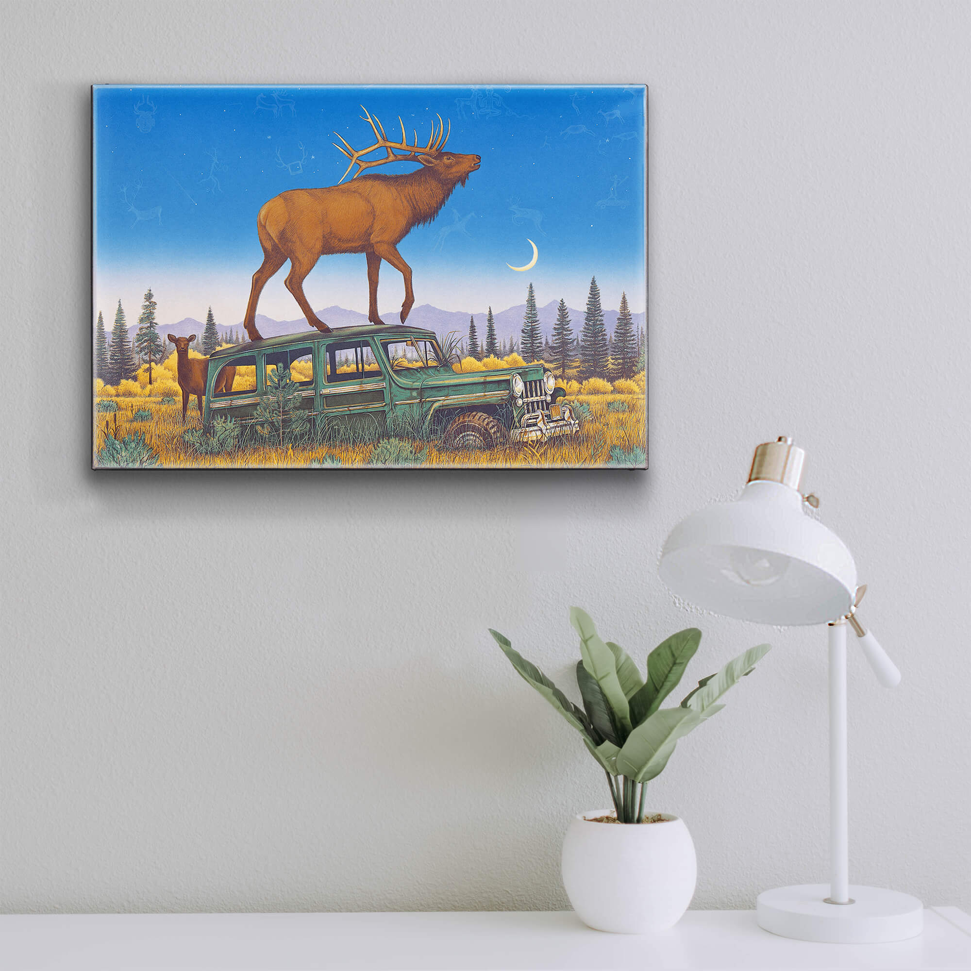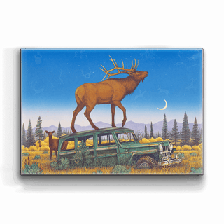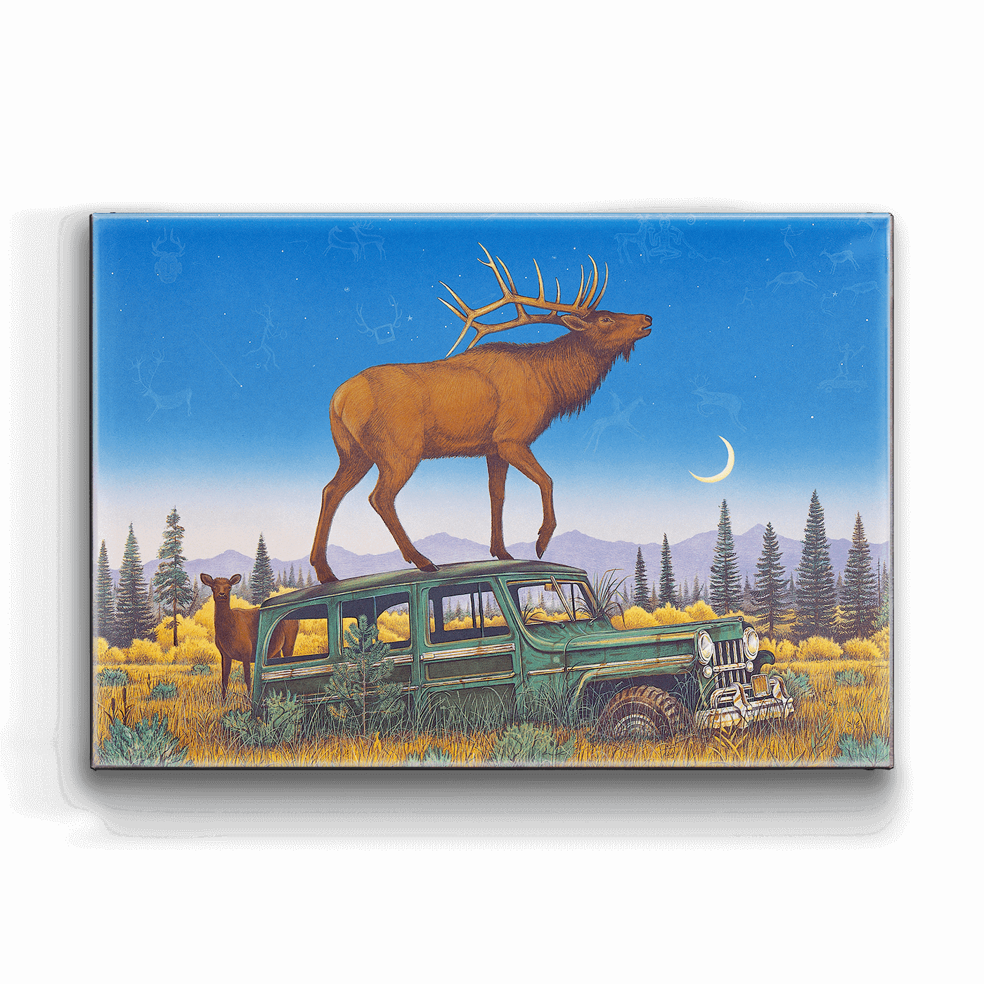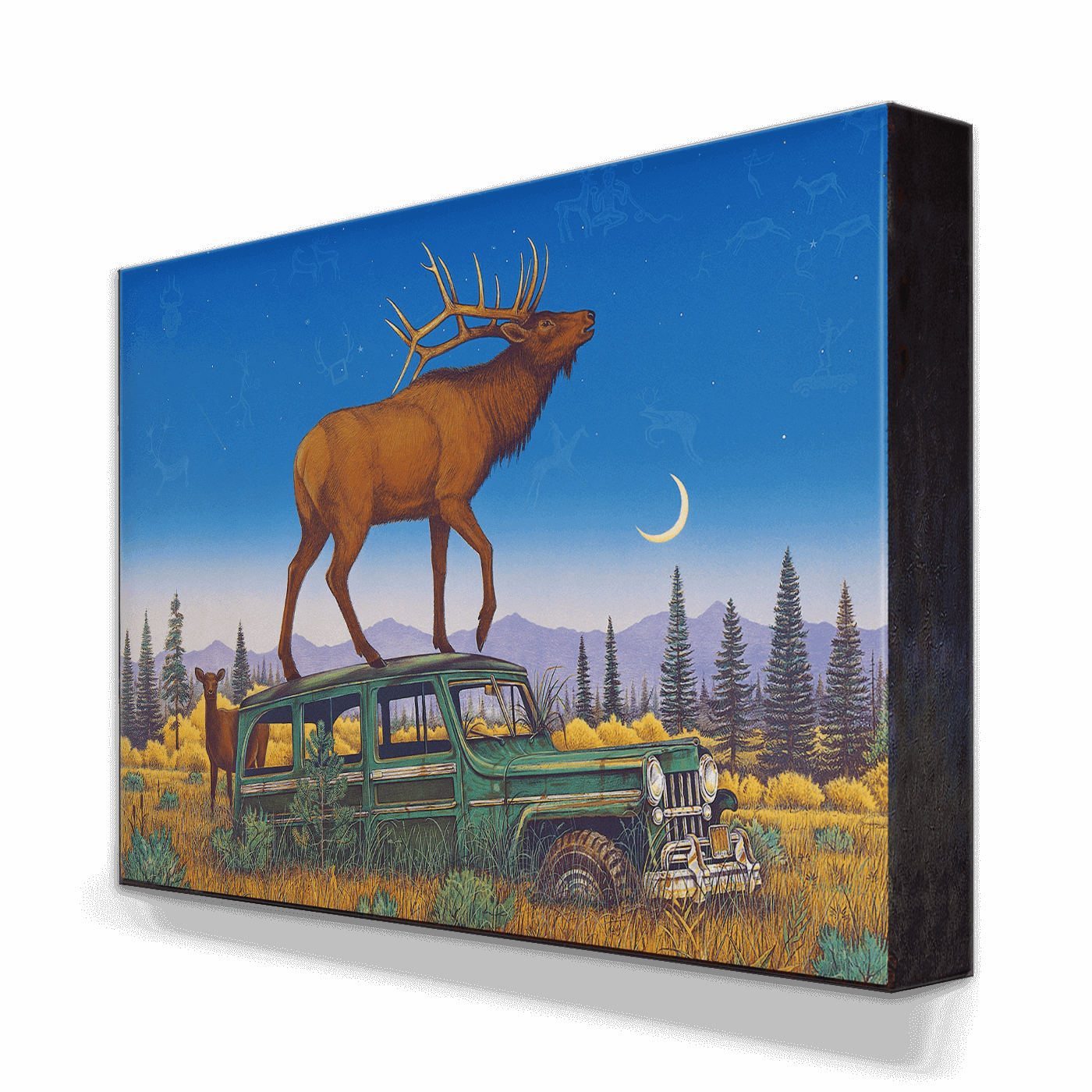 Embrace the untamed spirit of the wilderness with this dynamic piece of aluminum box-art from the collection of Monte Dolack. This piece captures a majestic bull elk standing atop an abandoned car, with a cow elk nearby, symbolizing natures reclamation of human spaces. The scene unfolds in a forest clearing with scattered trees, leading the eye to the silhouetted mountain range in the twilight distance. A crescent moon and stars adorn the sky, mingled with primitive cave drawing-style illustrations of animals and hunters, alongside a couple contemporary twists, melding past and present narratives. This artwork, evocative of Montana's rugged landscapes and rich history, is a compelling addition to any decor, perfect for those drawn to the wild and the whispers of ancestral tales.