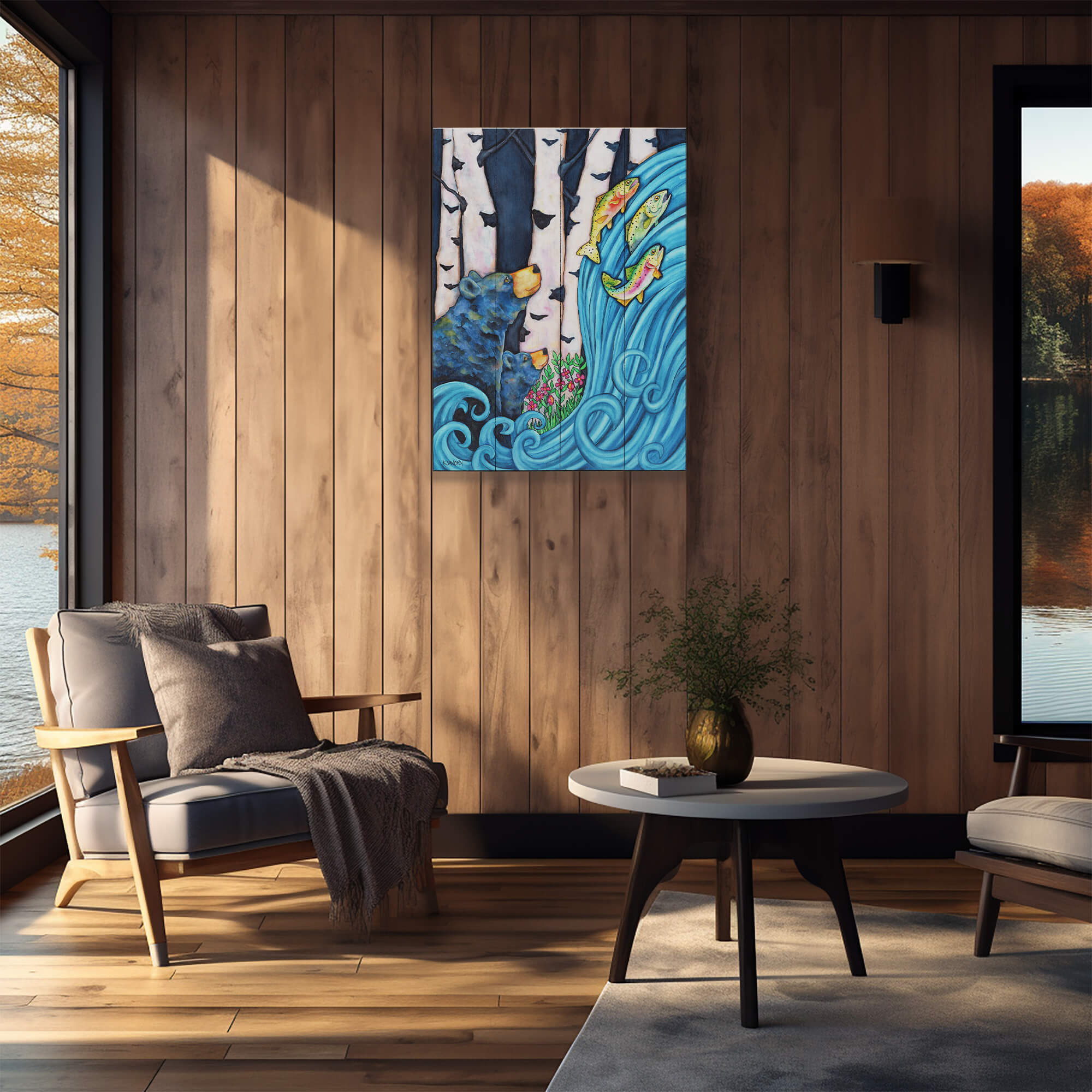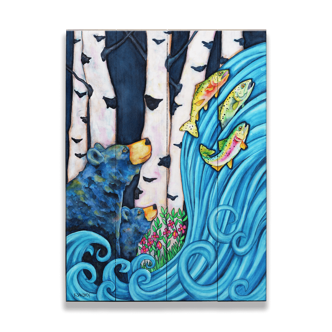 A stunning addition to your collection or a thoughtful gift for nature enthusiasts, this enchanting artwork portrays a mother bear and her cub gazing intently at lively, vivid fish leaping upstream, surrounded by vibrant wildflowers and striking aspen trees. The flowing blue waterfall and bright colors of the fish add movement and energy, creating a dynamic yet serene depiction of nature's beauty. Perfect for wildlife lovers, this piece brings a sense of adventure and tranquility to any space, making it ideal for rustic, modern, or eclectic decor themes.