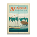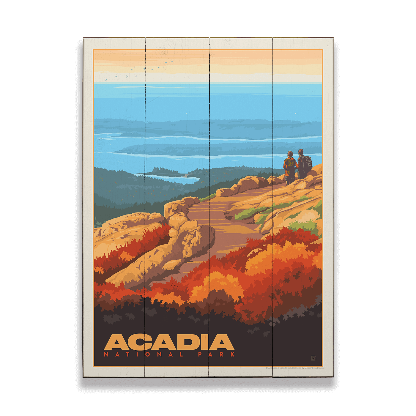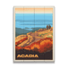 Capture the autumnal majesty of Cadillac Mountain with this captivating Acadia National Park poster. It portrays a couple standing on the summit, surrounded by the fiery hues of fall foliage, with sweeping views that stretch to the horizon. This piece invites you to witness the grandeur of Maine's highest peak and the tranquil beauty that envelops it as the seasons change. A perfect homage to the natural splendor found atop one of Acadia's most treasured landmarks.