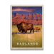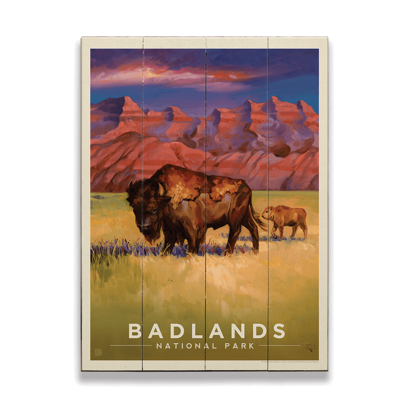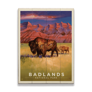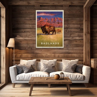 Step into the vivid wilderness with this colorful rendering of Badlands National Park. The warm, rich hues of sunrise or sunset paint the sky, while a mother bison and her calf roam the flowering fields. This artwork is a vibrant celebration of life in one of America's most unique landscapes, capturing the essence of the park's beauty and wildlife.