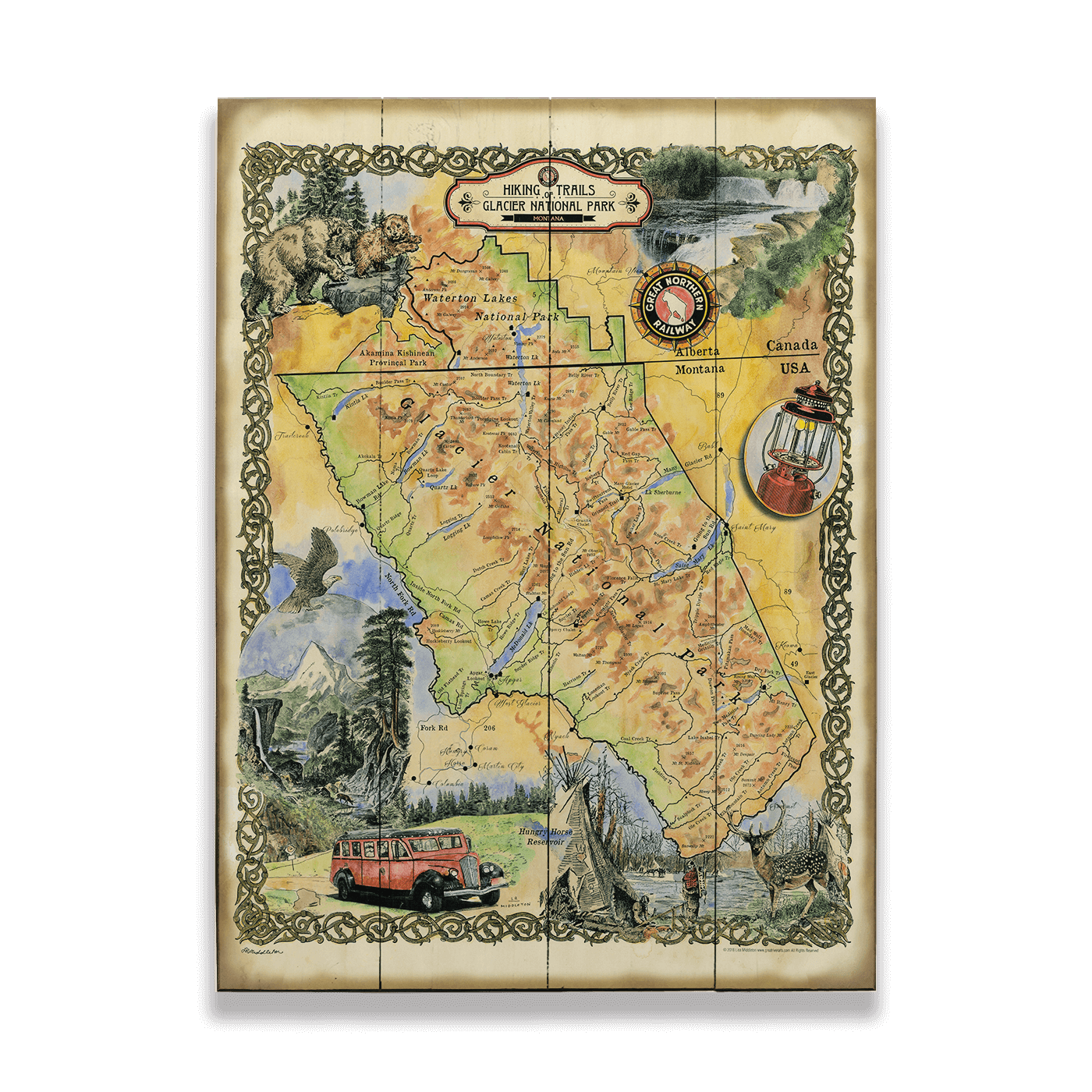 Get lost in the breathtaking beauty of the great outdoors with our decorative wood or metal map of one of the most stunning National Parks in the country. Glacier National Park is part of the Waterton-Glacier International Peace Park - a World Heritage Site and the world's first "international peace park." At Glacier, one can explore snow capped mountains, sparkling waterfalls, and an abundance of wildlife all while feeling the freedom of nature. Perfect for bringing the tranquility of the wilderness into your home, our wall hanging map showcases the stunning landscapes of this magnificent park.