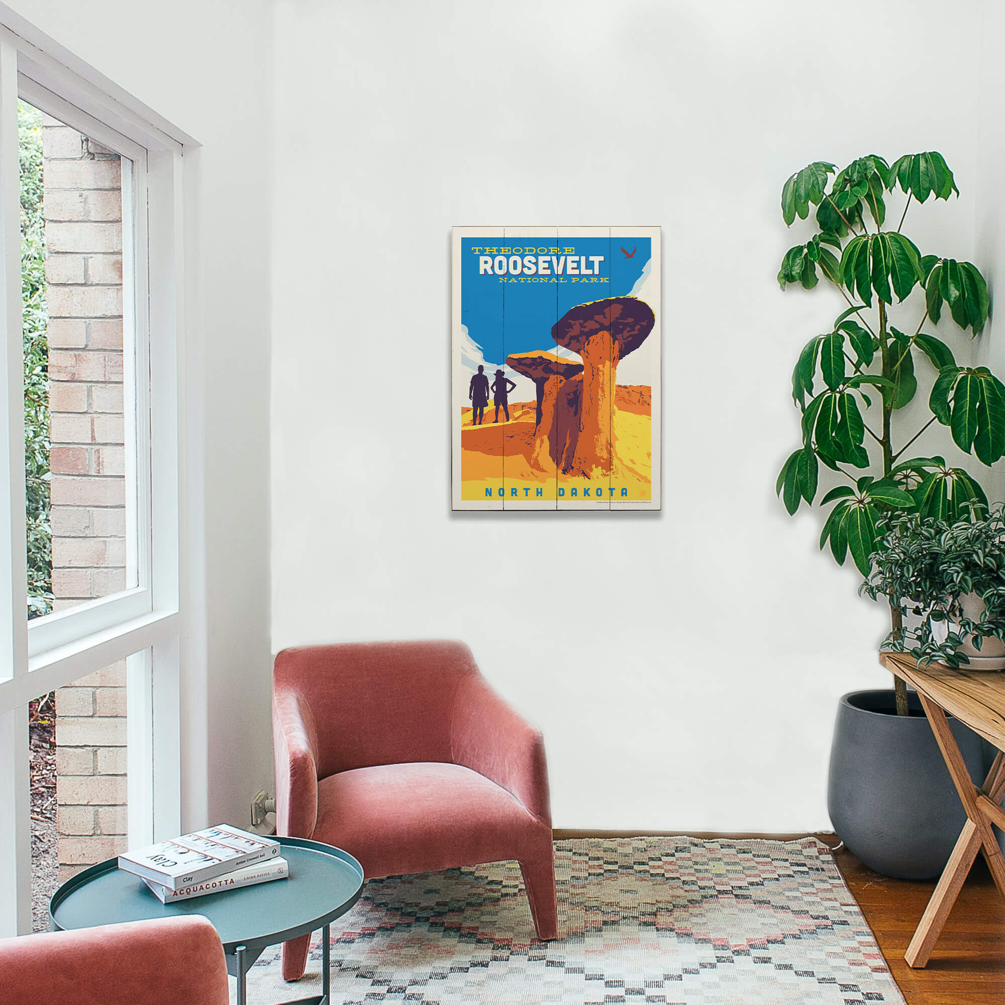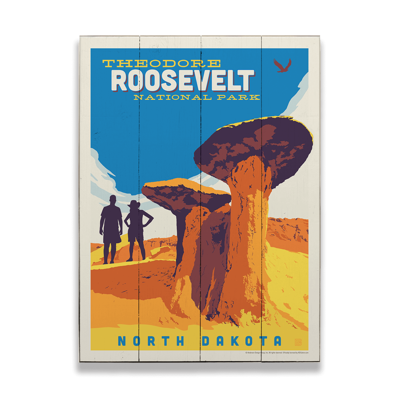 Step into a surreal desert dreamscape with this bold and colorful artwork of Theodore Roosevelt National Park. Featuring towering hoodoos and two hikers soaking in the dramatic landscape, the scene celebrates the park’s otherworldly geology and adventurous spirit. Located in the rugged Badlands of North Dakota, the park is famed for its layered rock formations, fossil-rich terrain, and wide-open vistas that inspired Theodore Roosevelt’s passion for preserving America’s wild places. Perfect for adventurers, geology buffs, or anyone with a love for the great outdoors, this print brings a pop of energy and exploration to any space.