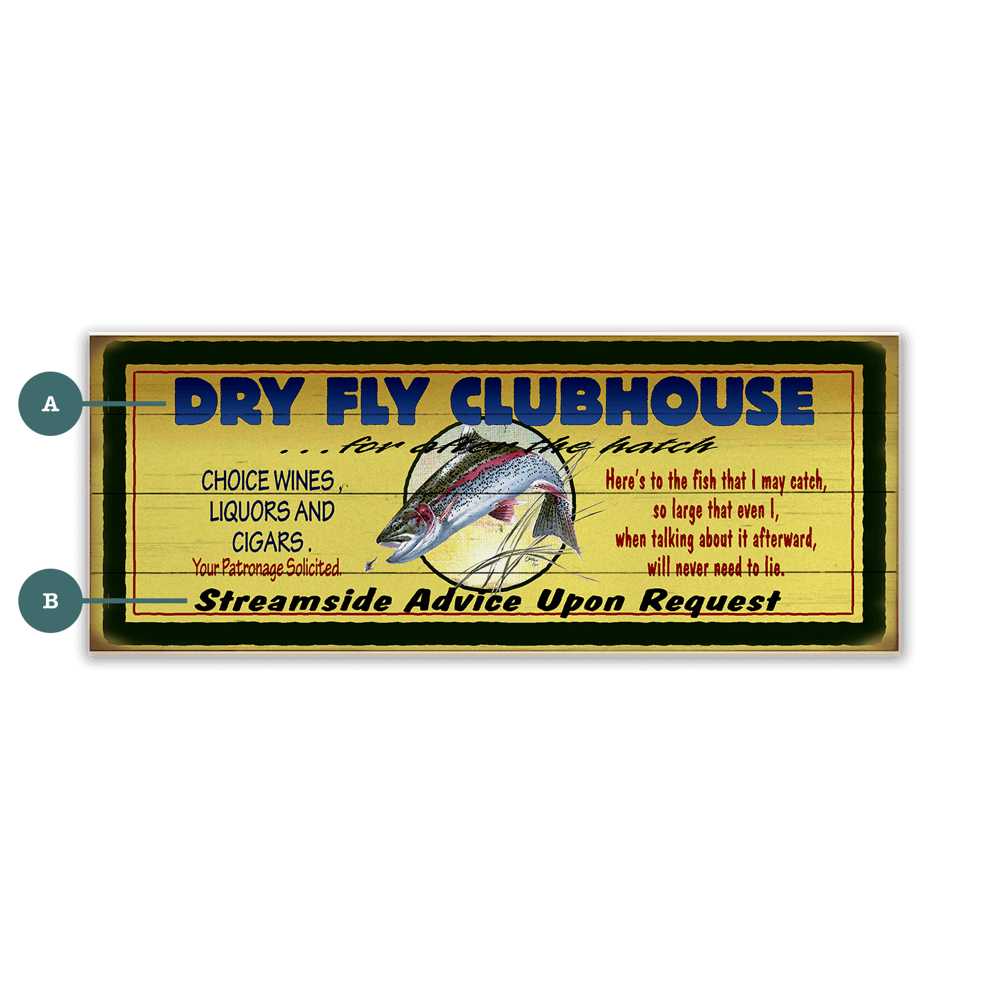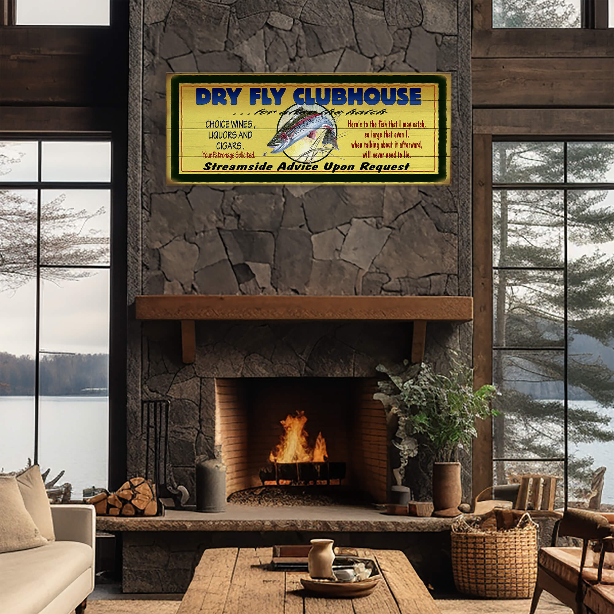 This sign features a classic fly fishing motif with a detailed trout illustration and a playful, old-school clubhouse aesthetic. Rendered in a vintage-inspired style, it captures the relaxed camaraderie, storytelling, and tradition that surround fly fishing culture.