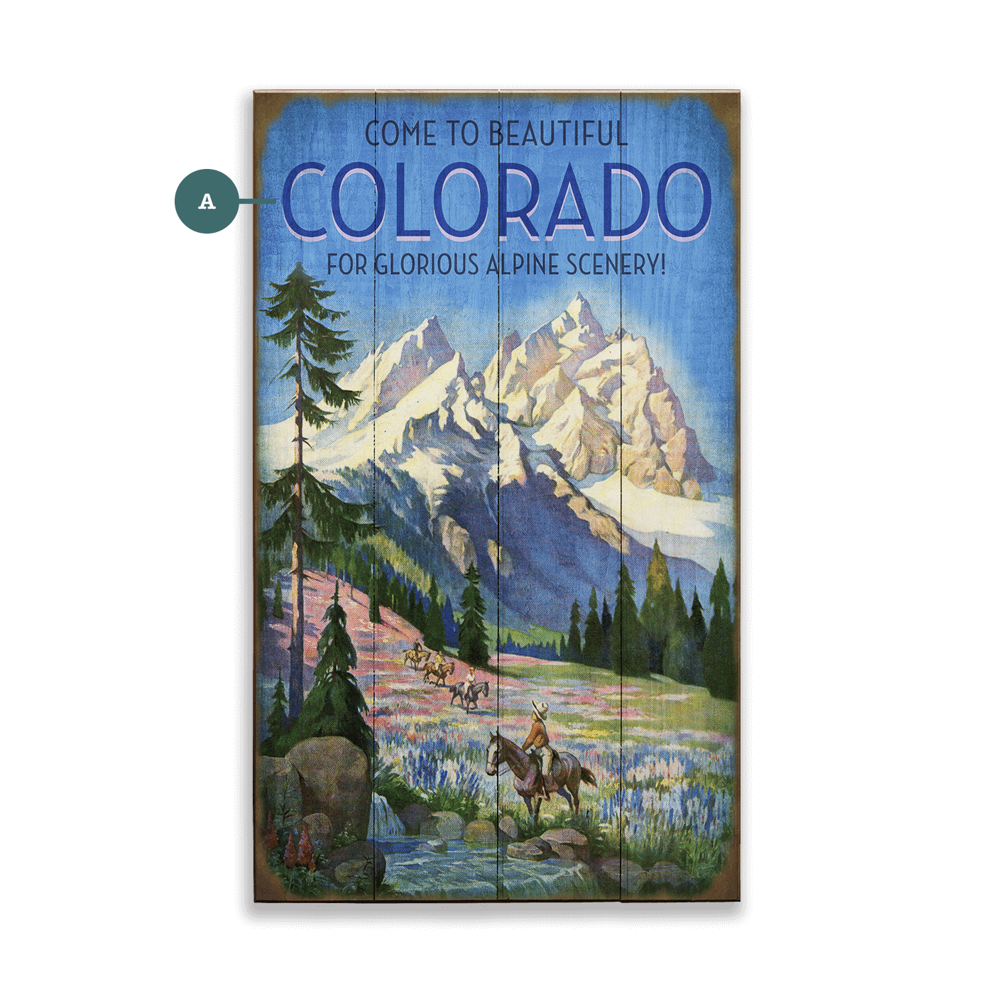Celebrate the beauty of the Rocky Mountains with this vintage inspired wall art. The scene features towering alpine peaks, colorful wildflower meadows, and a small group of riders exploring the landscape on horseback. Painted in soft, classic travel poster style, this artwork captures the spirit of wide open spaces, crisp mountain air, and the timeless adventure of the American West. Perfect for cabins, living rooms, and anyone who loves Colorado’s breathtaking scenery or nostalgic travel decor.
