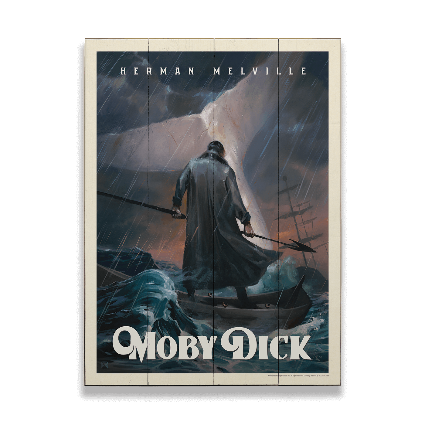 Bold and atmospheric, this artwork illustrates the drama of obsession and oceanic fury in Moby Dick, Herman Melville’s timeless tale of vengeance and man’s struggle against nature. Standing defiant in his long coat, a harpoon gripped in each hand, Captain Ahab faces the storm and the immense white whale rising before him—its tail slicing through the rain like a ghostly monument to the sea’s power. Ideal for literature lovers, nautical spaces, or anyone drawn to the thrill of the unknown, it’s a striking tribute to one of the most enduring stories in American fiction.