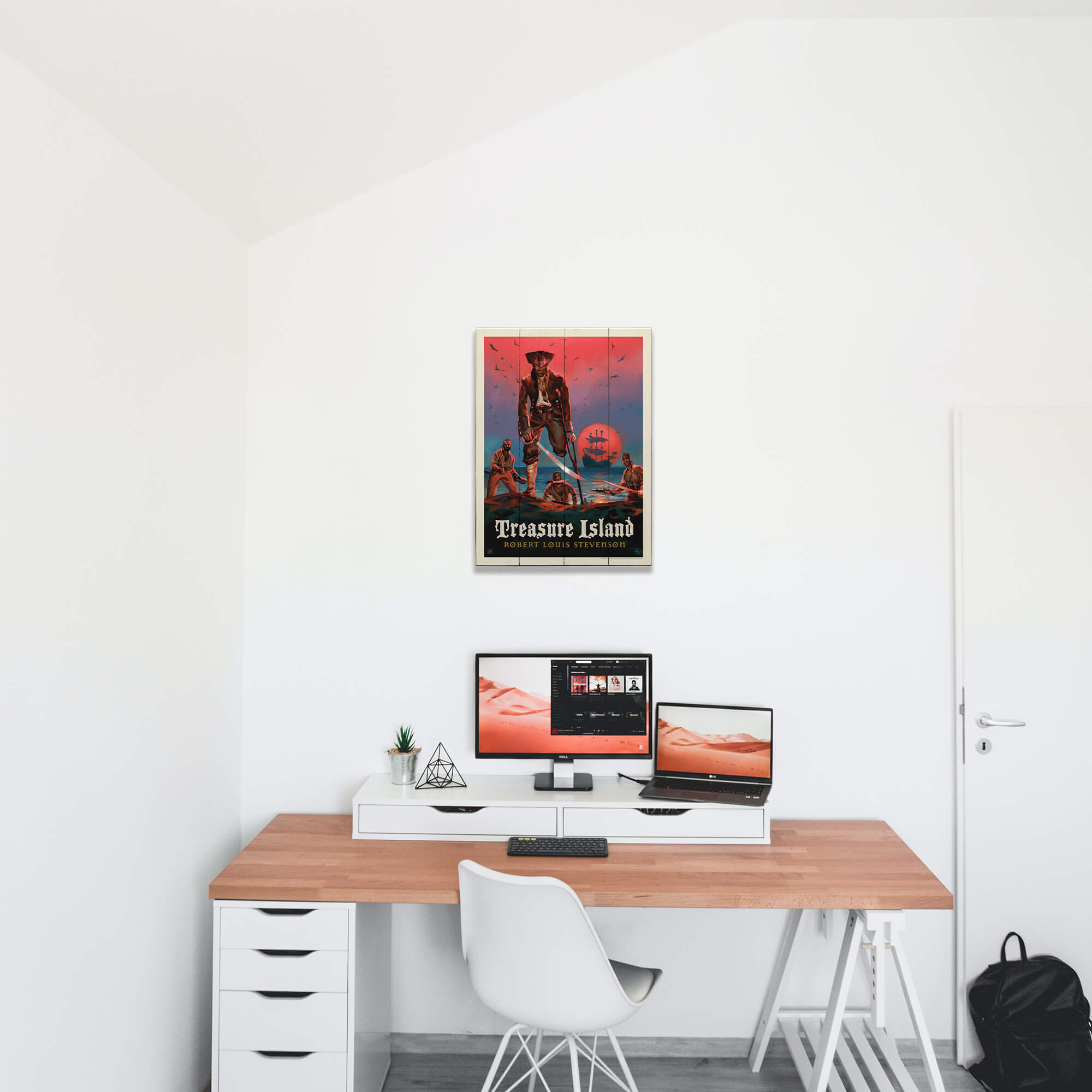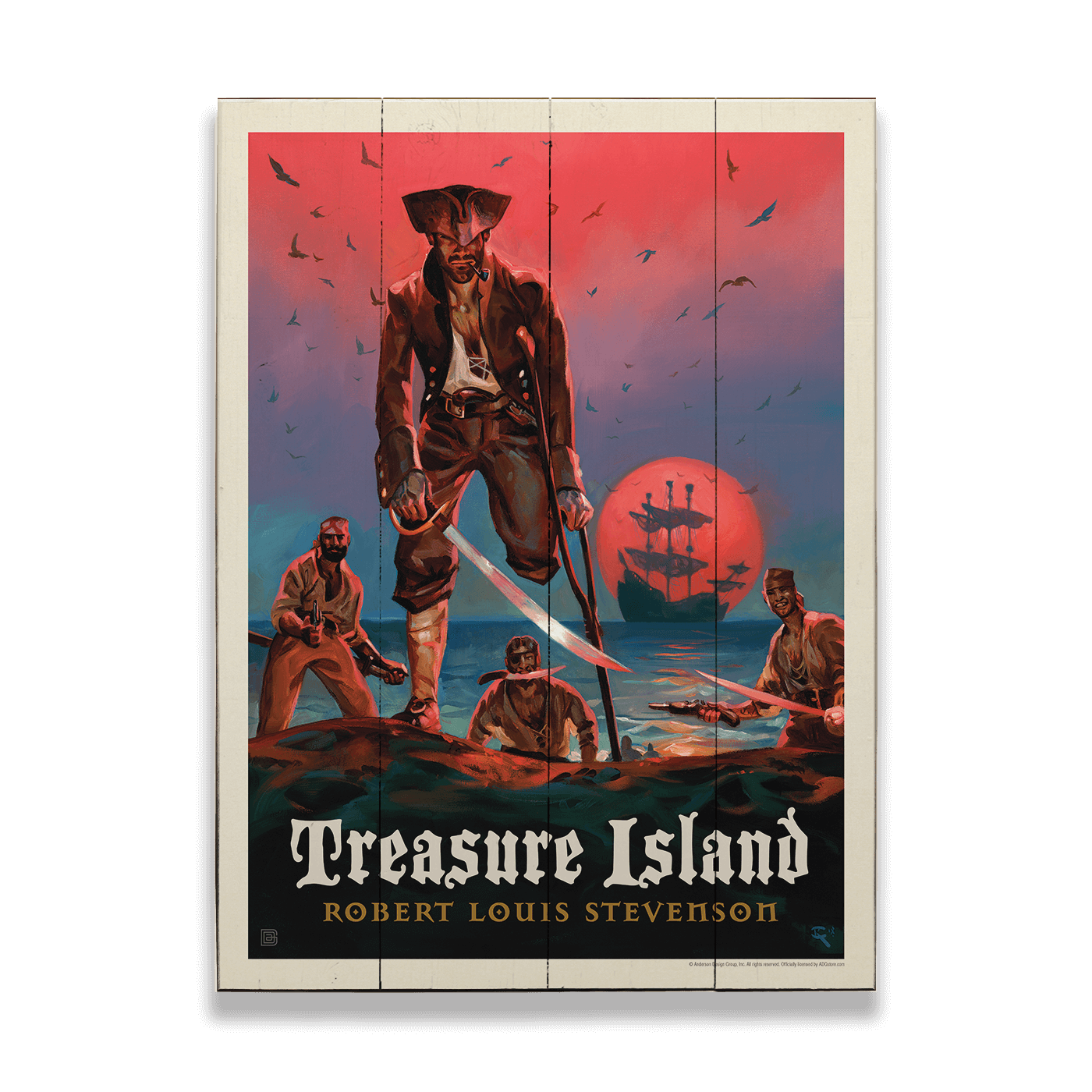 Packed with swashbuckling energy, this vivid depiction of Treasure Island captures the thrilling chaos of life on the high seas. At center stage, Long John Silver stands with sword drawn, surrounded by his crew, as a blood-red sun sets behind a ghostly galleon. Inspired by Robert Louis Stevenson’s iconic adventure novel, this artwork conjures the danger, betrayal, and buried treasure that have captivated readers for generations. With its dramatic palette and bold composition, it’s a fitting tribute to a literary classic, perfect for fans of nautical lore, vintage adventure, or storytelling with a sharp edge.