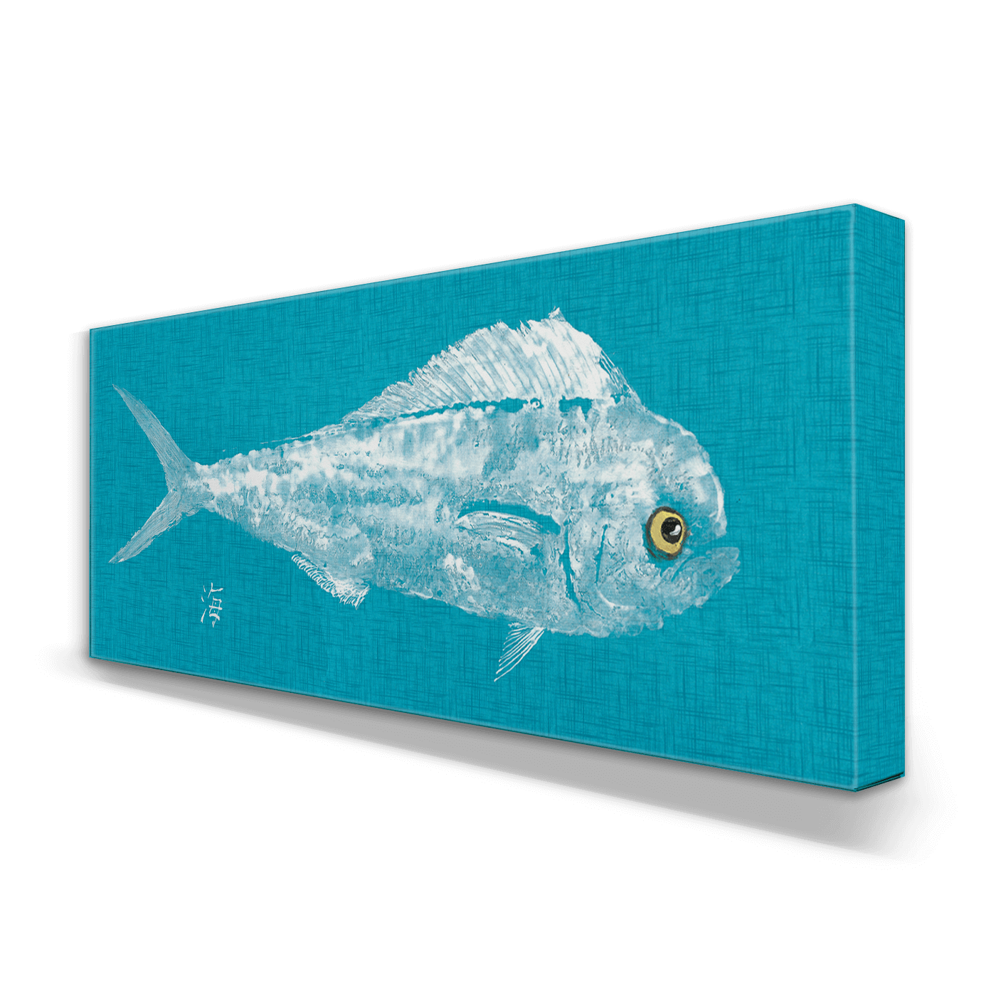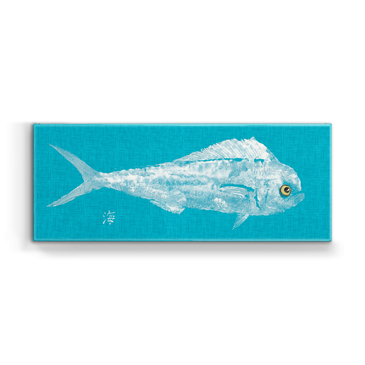 This bold and contemporary artwork captures the spirit of traditional gyotaku (Japanese fish printing) in a modern coastal palette. Featuring a detailed white impression of a dolphinfish (mahi-mahi) set against a bright teal background, the piece brings the grace and motion of the ocean into any space. The clean lines and textured effect give it an artistic, almost fossil-like quality—ideal for beach houses, coastal kitchens, or lakefront retreats seeking a fresh yet timeless look. A small kanji character meaning “ocean” subtly anchors the design with maritime authenticity.
