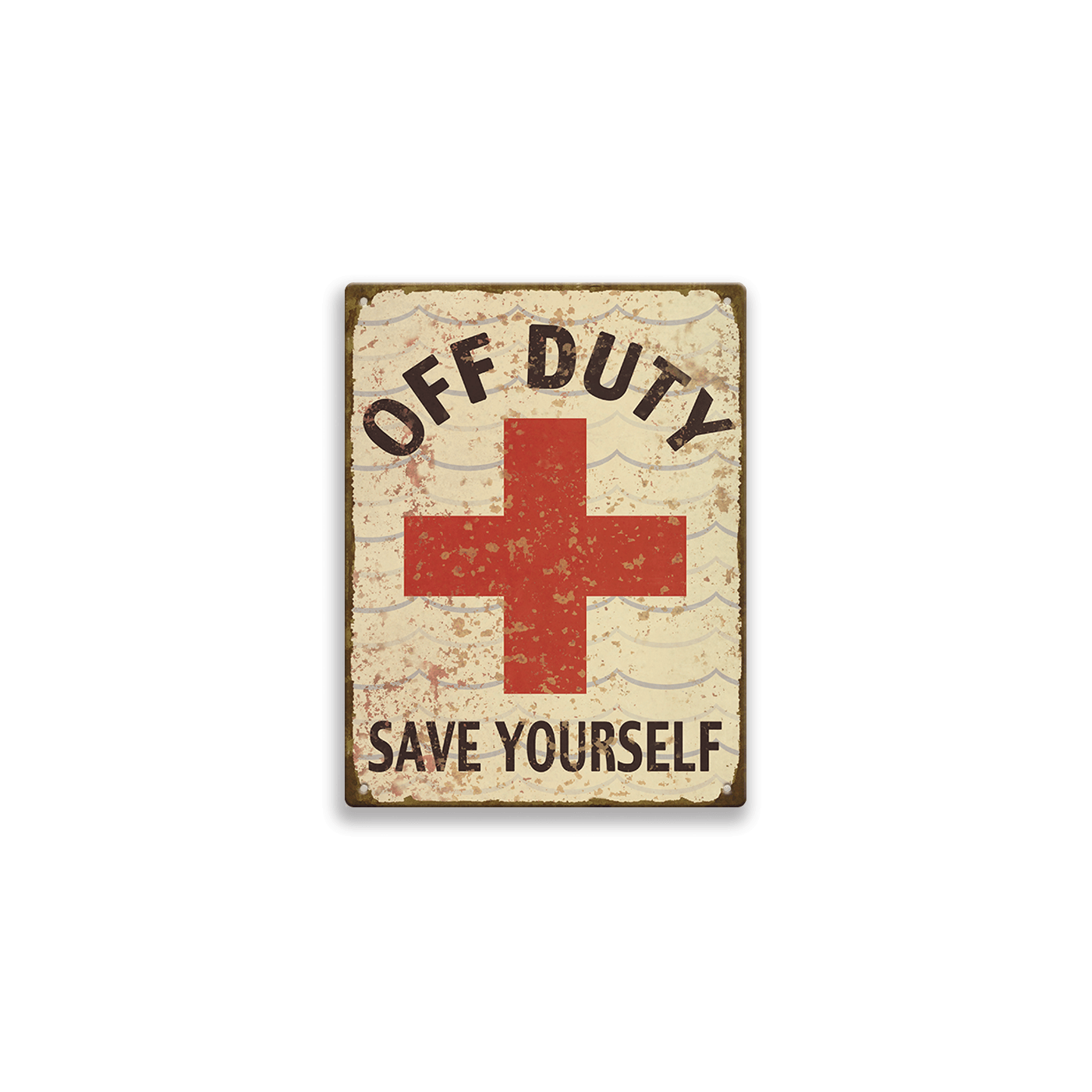 Add a dose of humor to your home, cabin, or workspace with this vintage-style “Off Duty – Save Yourself” sign. Featuring a bold cross symbol and a distressed, weathered finish, the design playfully mimics old emergency signage while delivering a tongue-in-cheek message that’s perfect for anyone who needs a break. Available in two color variations, this piece blends rustic character with lighthearted personality, making it a fun accent for bathrooms, bars, lake houses, workshops, or anywhere a good laugh is welcome.