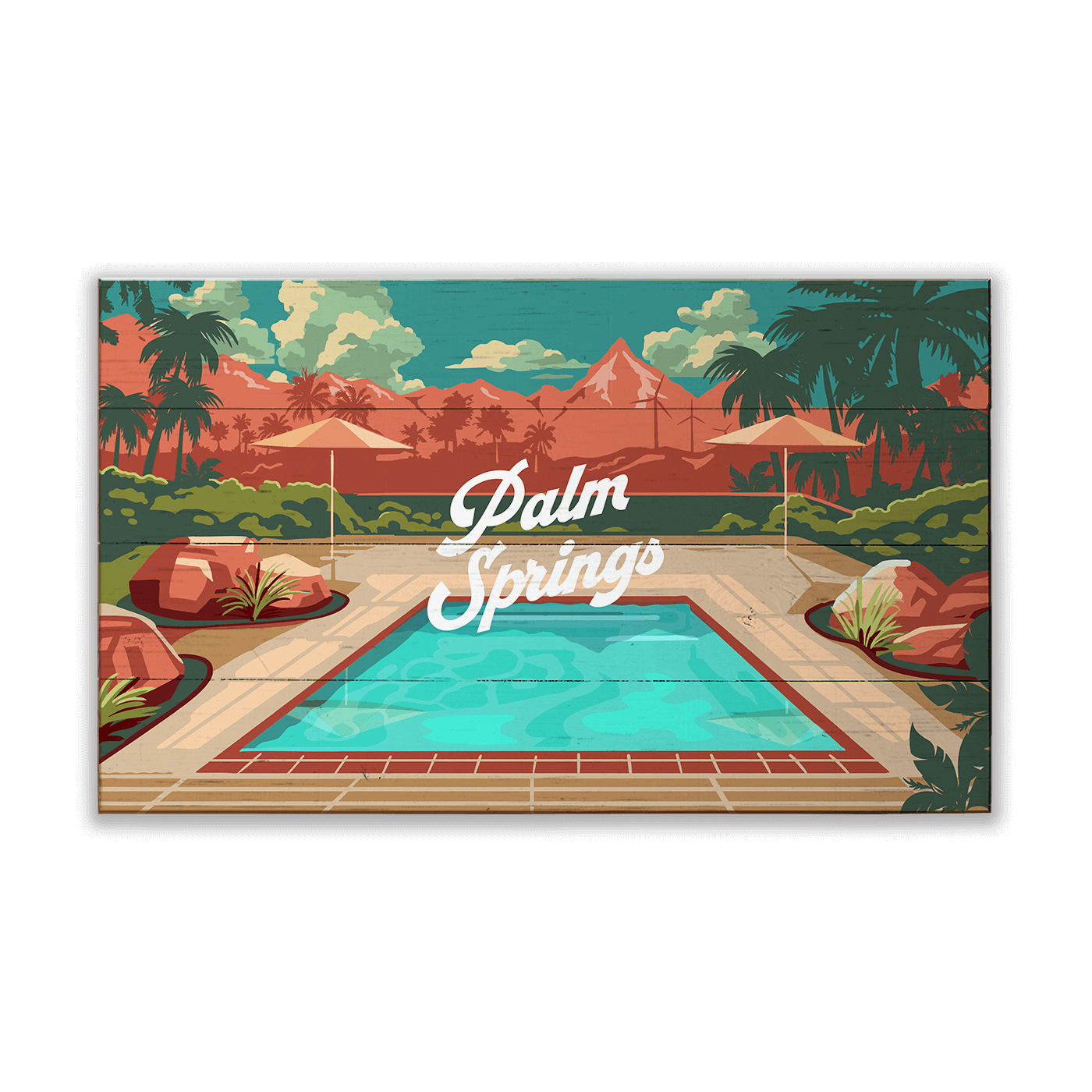 Bring the sun-soaked charm of Palm Springs into your space with this vibrant retro-inspired poolside scene. Cool turquoise water, iconic desert landscaping, and dramatic mountain silhouettes come together to capture the effortless glamour of mid-century desert vacations. Warm tones, lush palms, and vintage styling give the artwork a relaxed, nostalgic feel perfect for brightening up living rooms, patios, pool houses, or anywhere that could use a touch of classic Palm Springs allure.