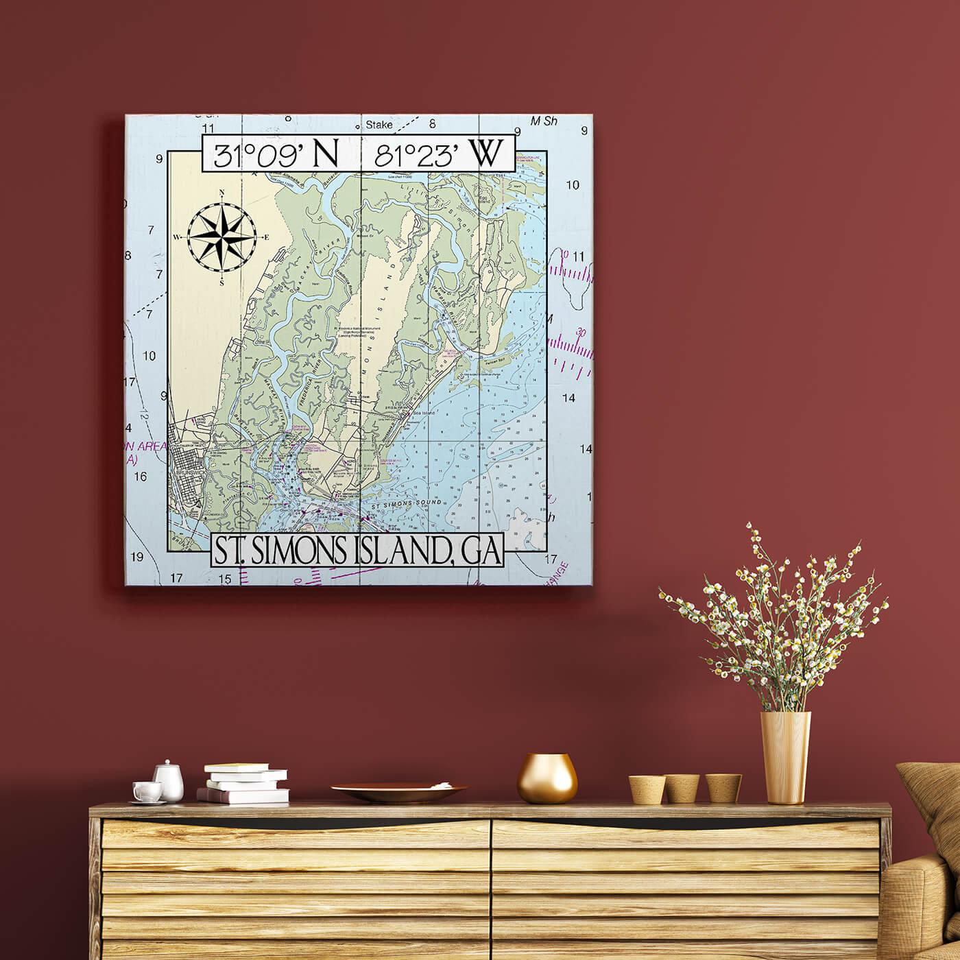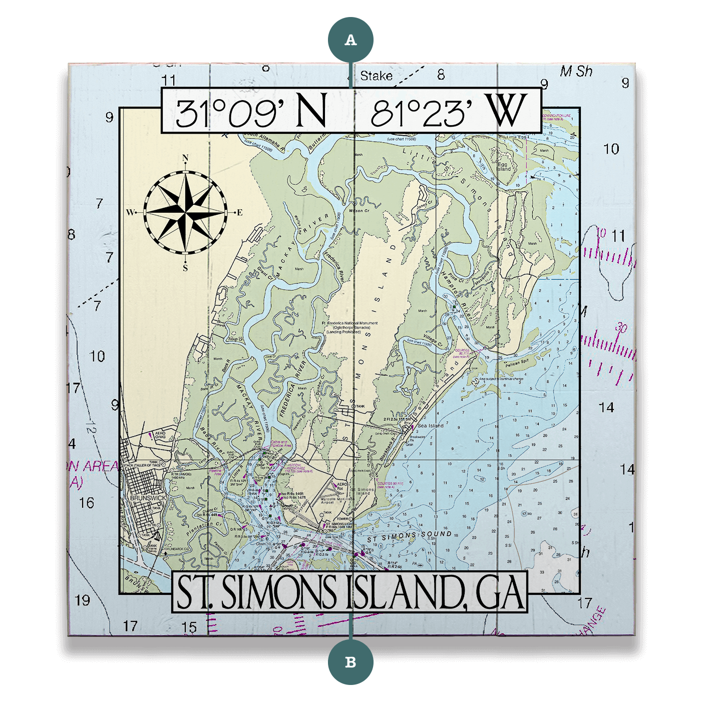 This nautical chart artwork of St. Simons Island, GA, showcases the island’s intricate waterways, historic harbor, and detailed coastal features. Part of Georgia’s Golden Isles, the region is celebrated for its rich maritime heritage, charming southern character, and expansive salt marshes that support diverse wildlife. With customizable coordinates and title, this piece offers a personal way to commemorate a connection to this beloved coastal destination.