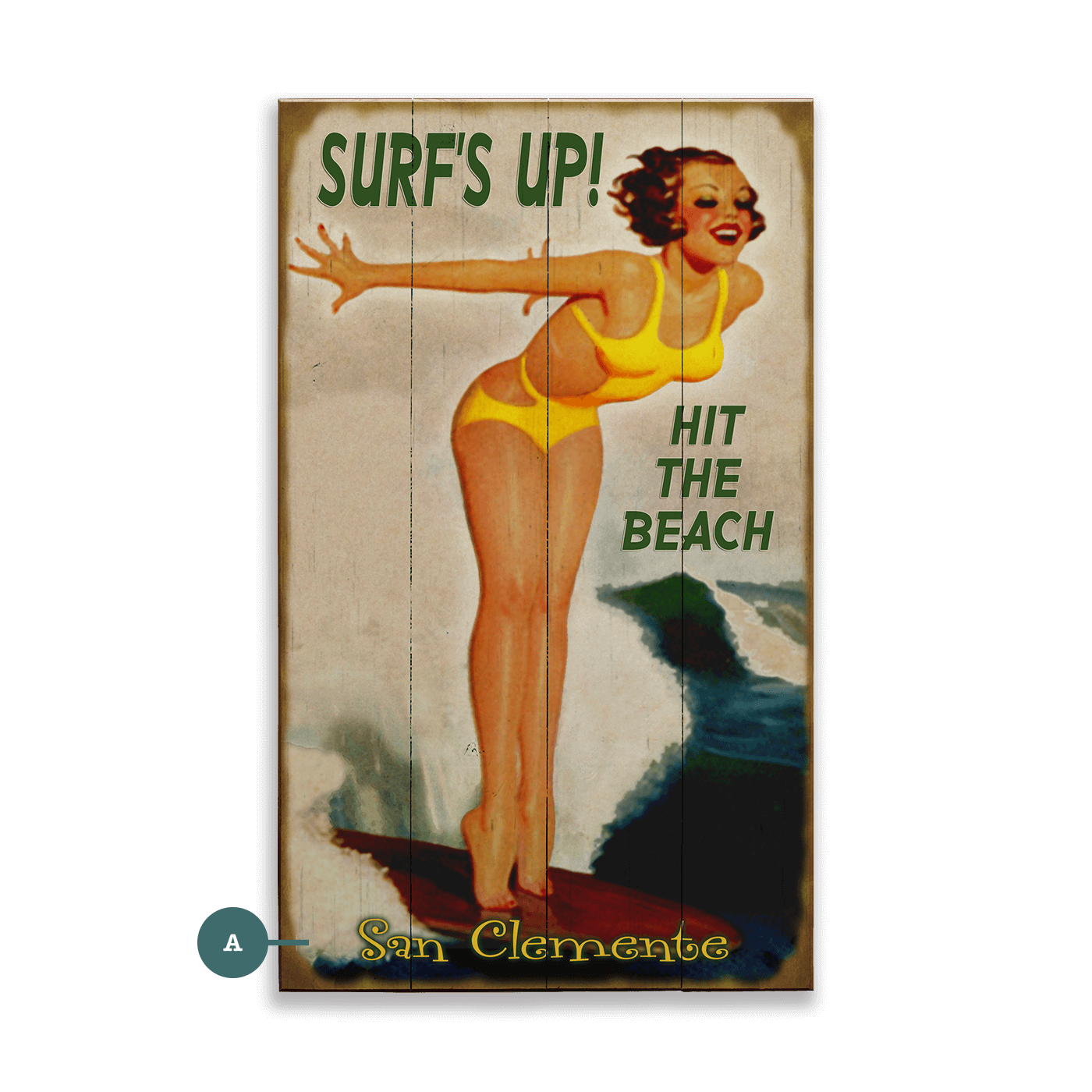 This vintage-style surf design channels classic beach-poster nostalgia with a playful, pin-up-inspired surfer poised on her board as a wave curls in behind her. Sun-warmed colors, bold lettering, and a weathered, timeworn finish give it that authentic old-school look - like a roadside souvenir you might have picked up on a legendary coastal trip.