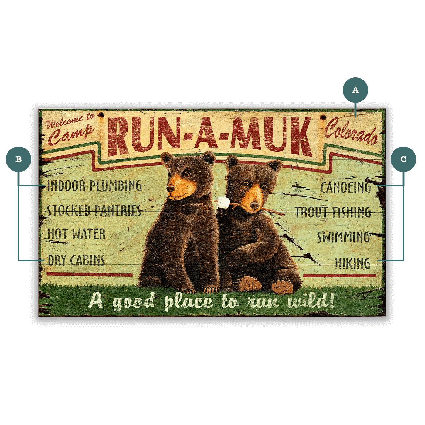 This vintage-style artwork features two playful bears in a whimsical camp scene, capturing the carefree spirit of outdoor adventures. With retro lettering and a distressed finish, it evokes nostalgia for classic summer camp experiences. Perfect for adding a fun, rustic touch to cabins, lodges, or nature-themed spaces, it brings a sense of wilderness charm and lighthearted fun to any decor.