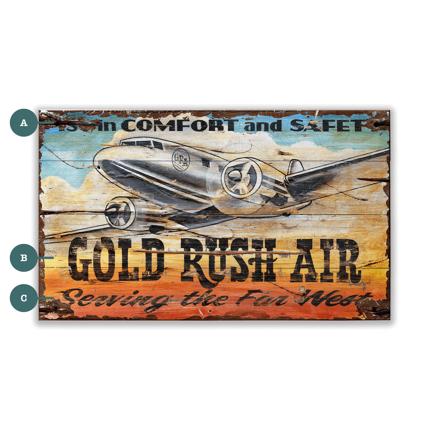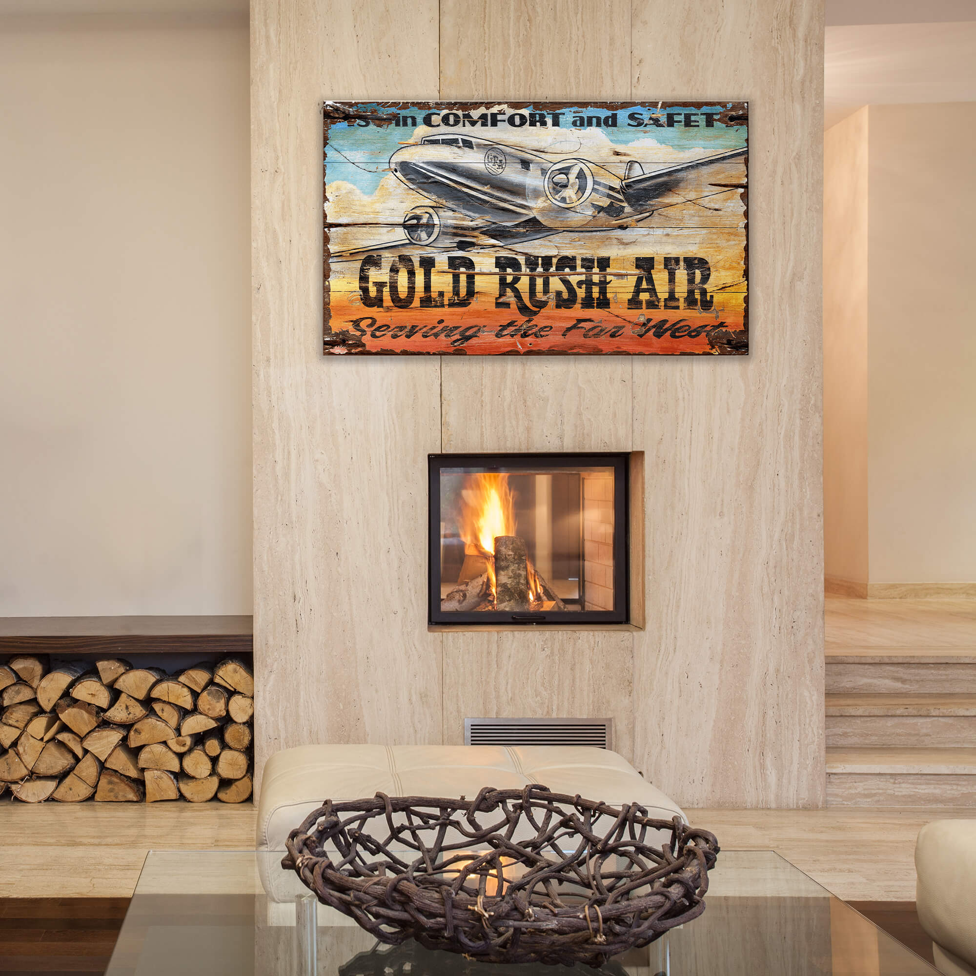 Bring the golden age of aviation to life with this bold, retro-style artwork featuring a vintage prop plane soaring through a richly painted sky. With distressed textures, nostalgic lettering, and classic slogans promising comfort and adventure, it evokes the pioneering spirit of early air travel. A perfect statement piece for home offices, dens, travel-themed rooms, or anyone drawn to the thrill of the open skies and the romance of old-school flight.