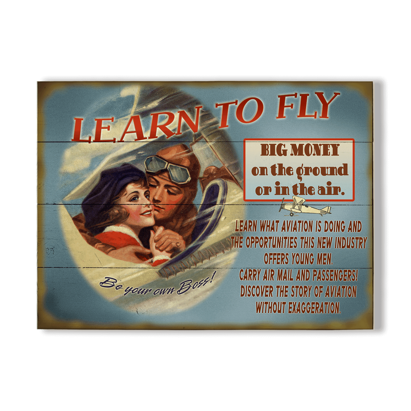 Dive into the exciting world of aviation with this captivating vintage artwork, "Learn to Fly." Featuring a romantic depiction of a pilot and his companion in the cockpit, this piece transports you to the early days of flight, where adventure and opportunity await. Ideal for both aviation enthusiasts and collectors of historical memorabilia, this piece is perfect for creating an inspiring atmosphere in homes, offices, or anywhere the spirit of early aviation is cherished.