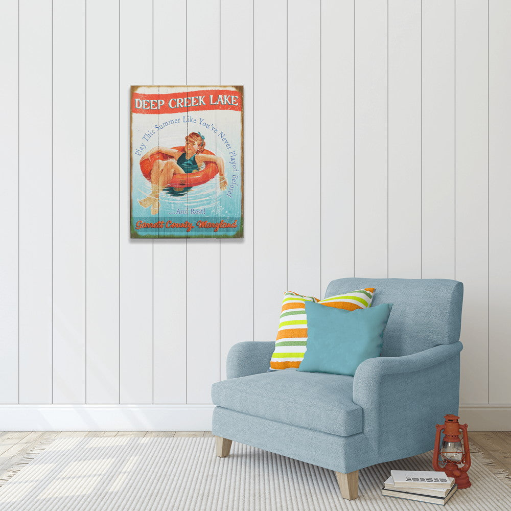 Add a splash of vintage summer charm to your decor with this playful lakeside sign, perfect for evoking carefree days spent on the water. Featuring a retro illustration of a smiling girl floating in a bright red inner tube, this piece captures the essence of youthful adventure and lakeside relaxation. The weathered finish and nostalgic typography give it an authentic, timeworn feel—ideal for cabins, beach houses, or family getaways. With its cheerful reminder to “Play This Summer Like You’ve Never Played Before... and Rest,” this sign invites you to soak up the sun, make memories, and unwind in true summer style.