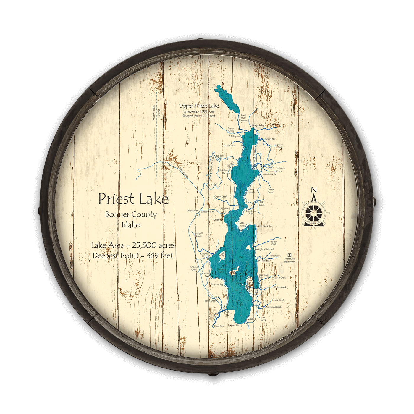 The beautifully crafted map features Priest Lake, located in the idyllic setting of Bonner County, Idaho, known as the "crown jewel" of the state. This topographic depiction offers a true appreciation of one of Idaho’s largest natural lakes. Priest Lake is encased by the majestic Selkirk Mountains and is replete with activities for every season. Its crystal-clear waters are filled with species like bluegill, kokanee, and trophy-size lake trout that make it an angler's paradise. In the winter, the snowy landscapes transform into a playground, catering to those who love the crisp outdoor air.