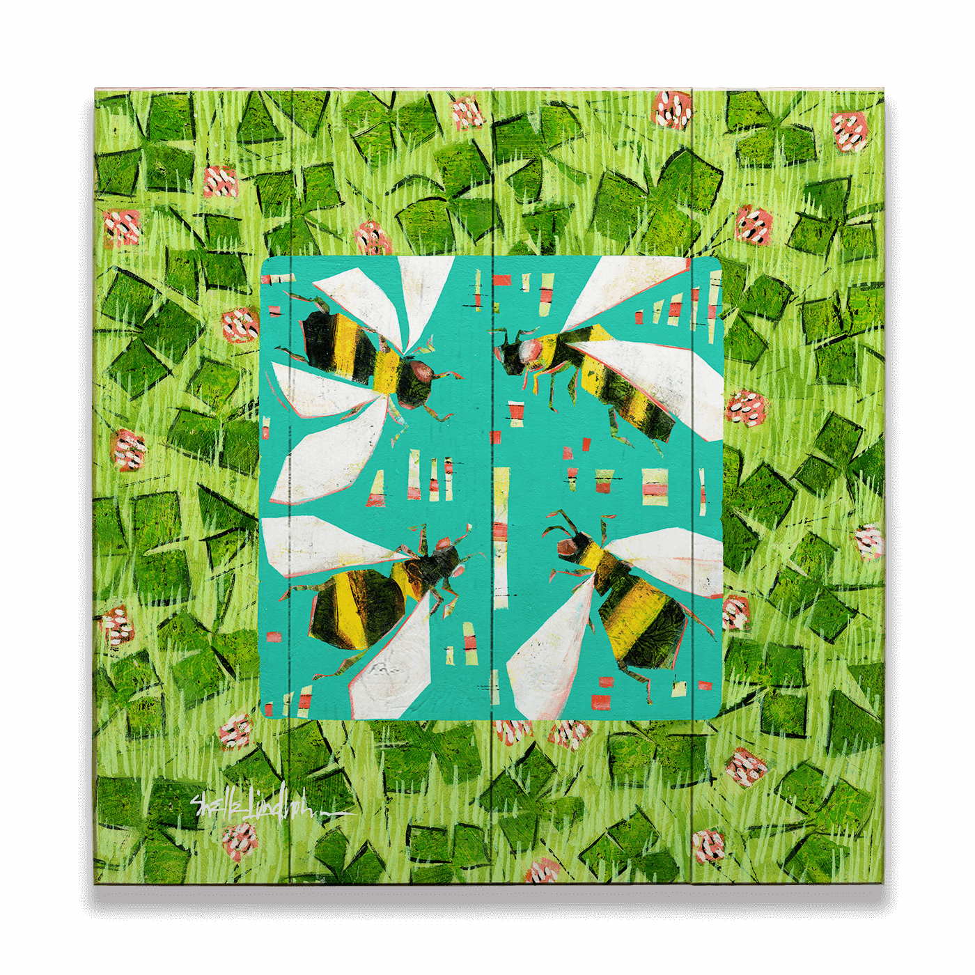 This vibrant artwork captures the dynamic energy of buzzing bees against a striking turquoise background, surrounded by a lush, textured green border of clover. The intricate details and vivid colors celebrate the vital role of pollinators in our ecosystem. Blending nature's charm with artistic expression, this piece is perfect for nature enthusiasts and eco-conscious art lovers.