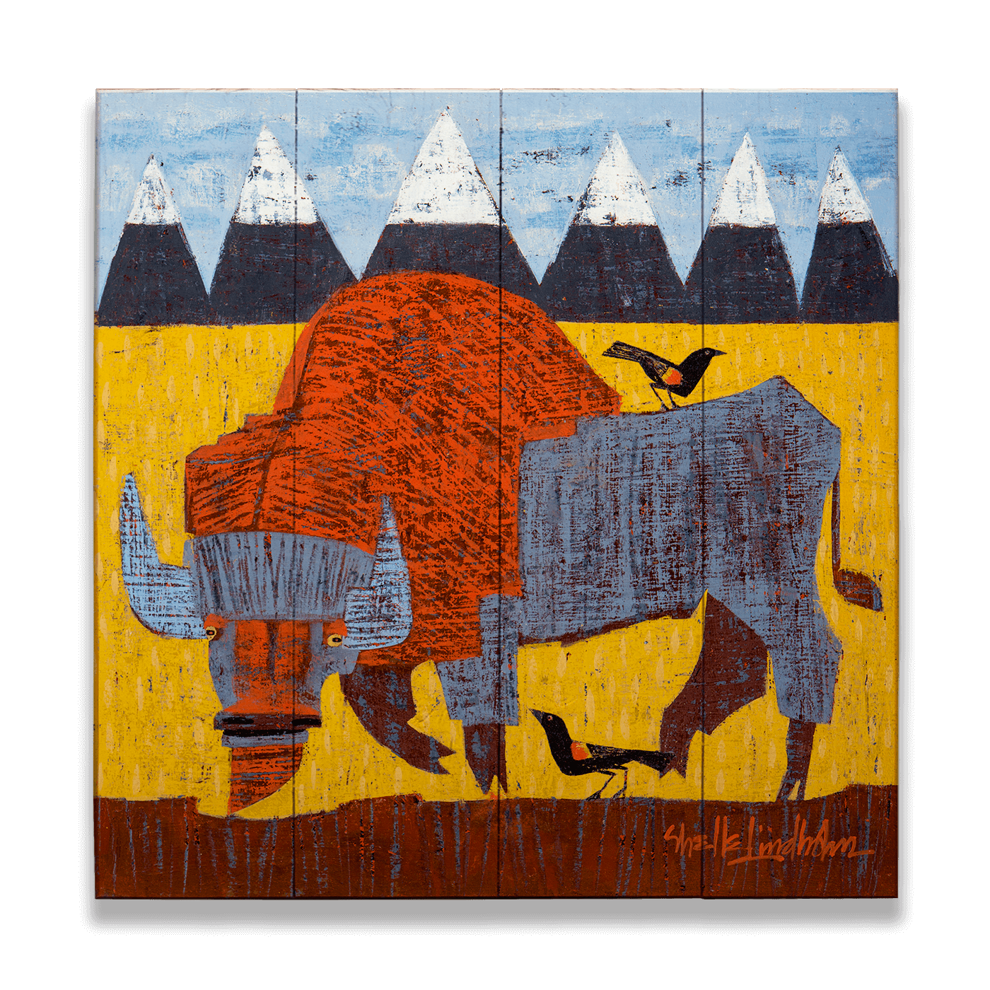 Add a timeless tribute to the wild and free spirit of nature to your decor with this bold and rustic artwork showcasing a majestic buffalo in striking red and blue tones. The golden prairie backdrop with snow-capped mountains on the horizon and accompanying red-winged blackbirds captures the essence of the untamed American West, making this an ideal centerpiece for animal lovers or western-themed art enthusiasts.