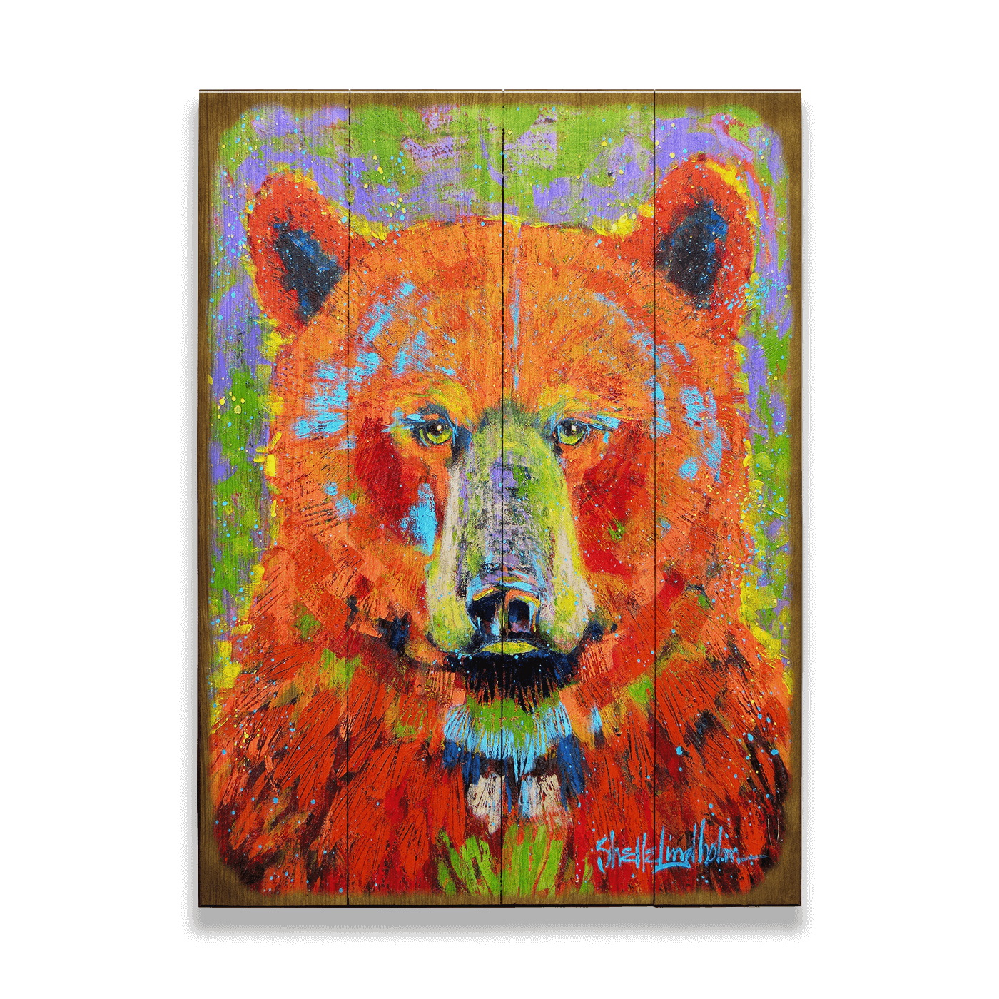 Discover the intense allure of this expressive bear portrait, where blazing splashes of color come to life through dynamic and textured brushstrokes. The artwork showcases a compelling mix of orange, green, and purple hues, creating an almost ethereal glow that radiates from the canvas. Perfect for art enthusiasts looking to add a bold statement piece to their collection, this painting captures the raw and majestic spirit of wildlife with a modern, artistic twist.