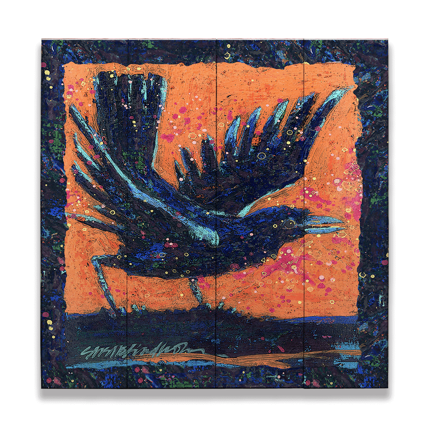 "Dream Catcher" is a mesmerizing artwork that captivates with its vivid portrayal of a crow, set against a fiery orange backdrop speckled with vibrant dots and swirls that seem to dance around the canvas. This piece beautifully combines the dynamic energy of movement with the mystical essence of dreams, portrayed through the bird's striking blue and black plumage that contrasts dramatically with the warm tones of the background. Ideal for those who love art that inspires and awakens the imagination.