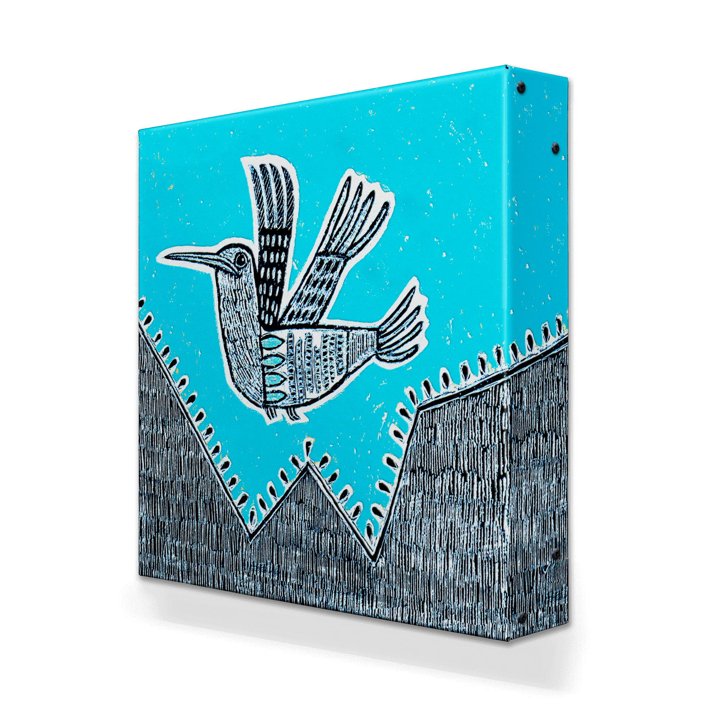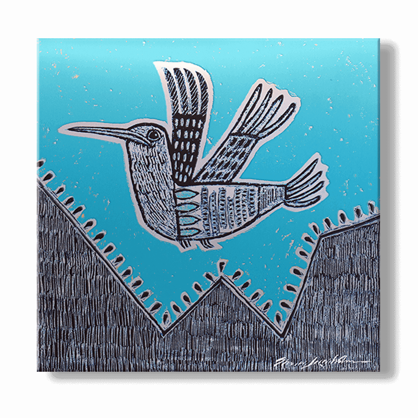 Part of our four-piece El Colibri collection, this vibrant artwork captures the ethereal beauty of the hummingbird, delicately rendered against a vivid backdrop of serene turquoise. The rough, scraped textures allow the polished finish of the metal to shine through, both within the bird and in the surrounding space, adding depth and luminosity to the scene. Soaring through a bright sky above textured mountains, this piece is a perfect blend of modern artistry and nature's raw allure.