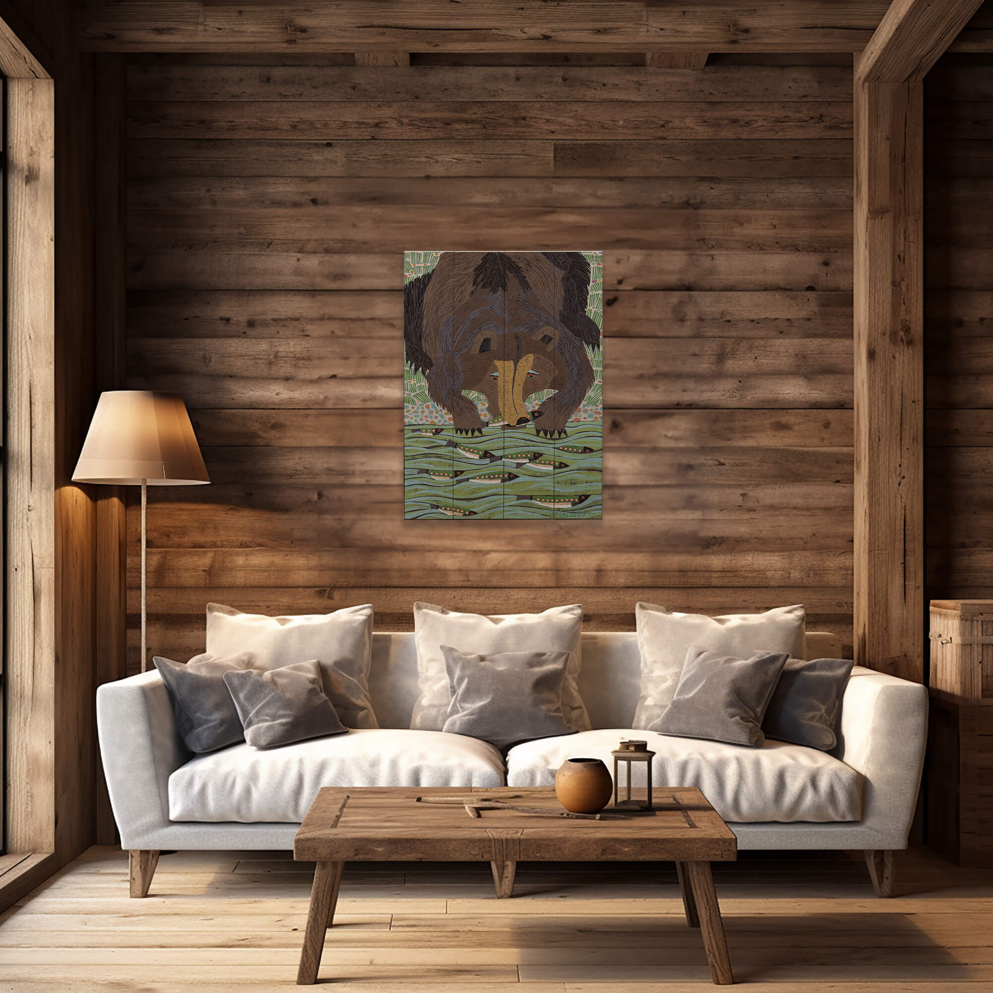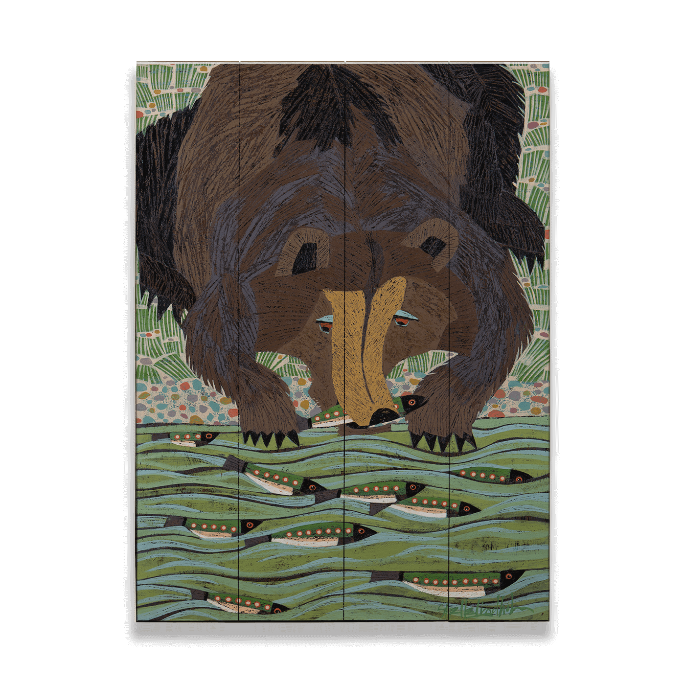 This richly textured artwork captures the quiet power of a bear hunched low over a stream, eyes focused and paws poised among a tangle of salmon. Stylized fish flow like ribbons through layered green waters, their spotted scales echoing the earthy tones of the background foliage. Full of warmth, movement, and rustic charm, it brings a sense of seasonal rhythm to any nature-inspired living room, fishing cabin, or mountain lodge.