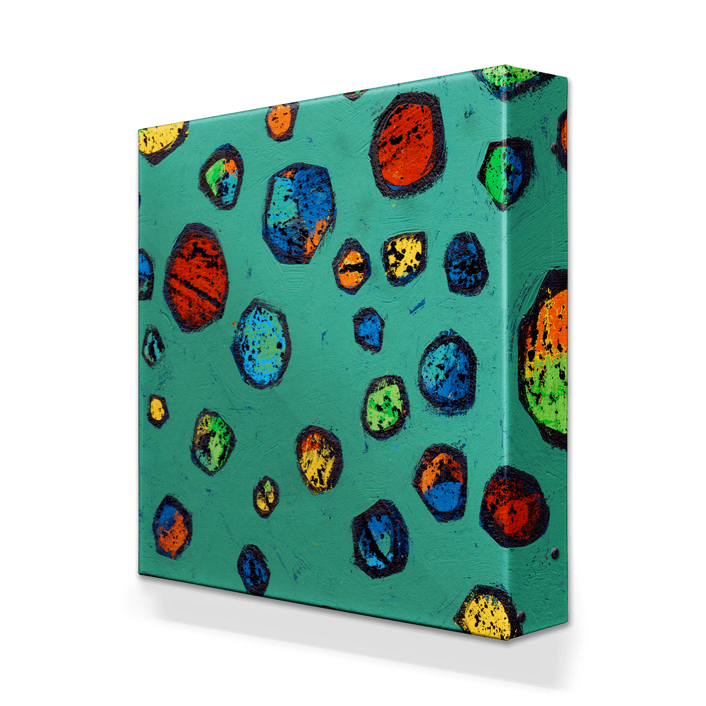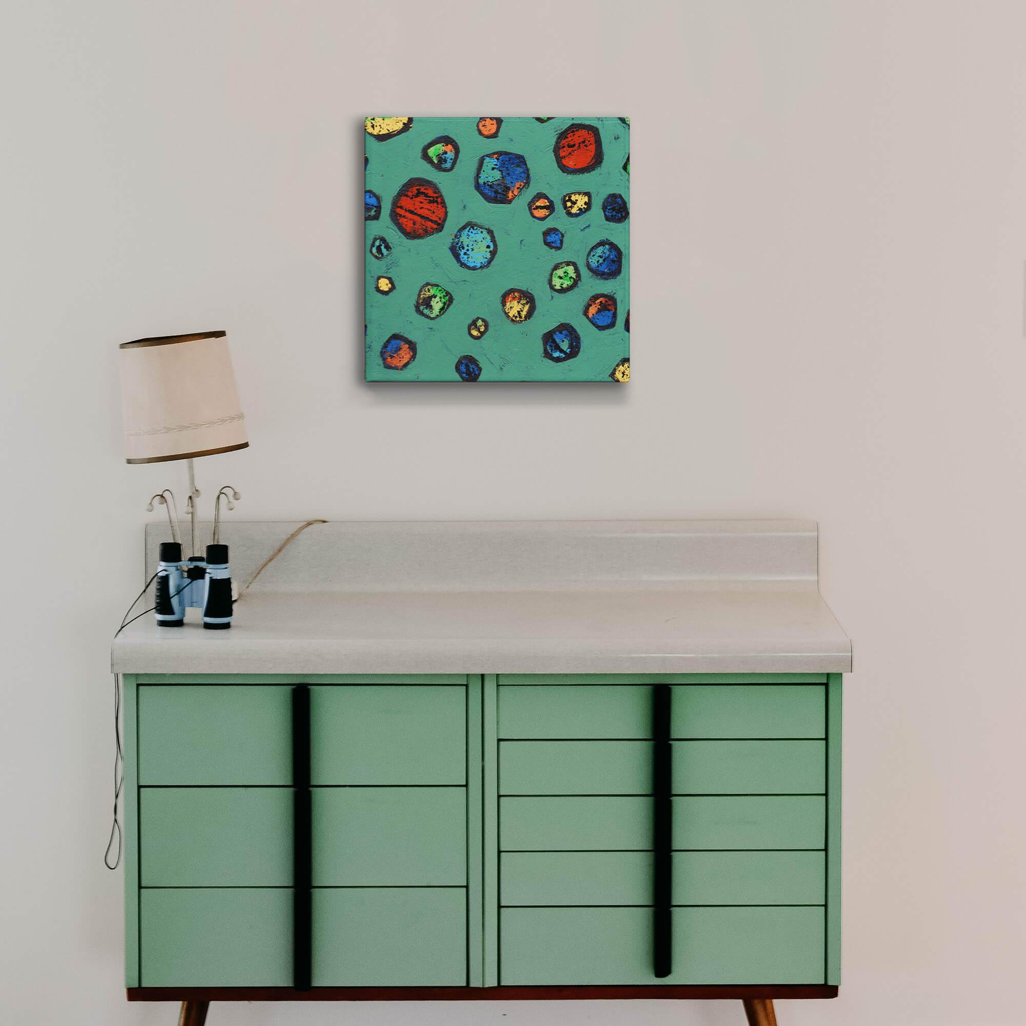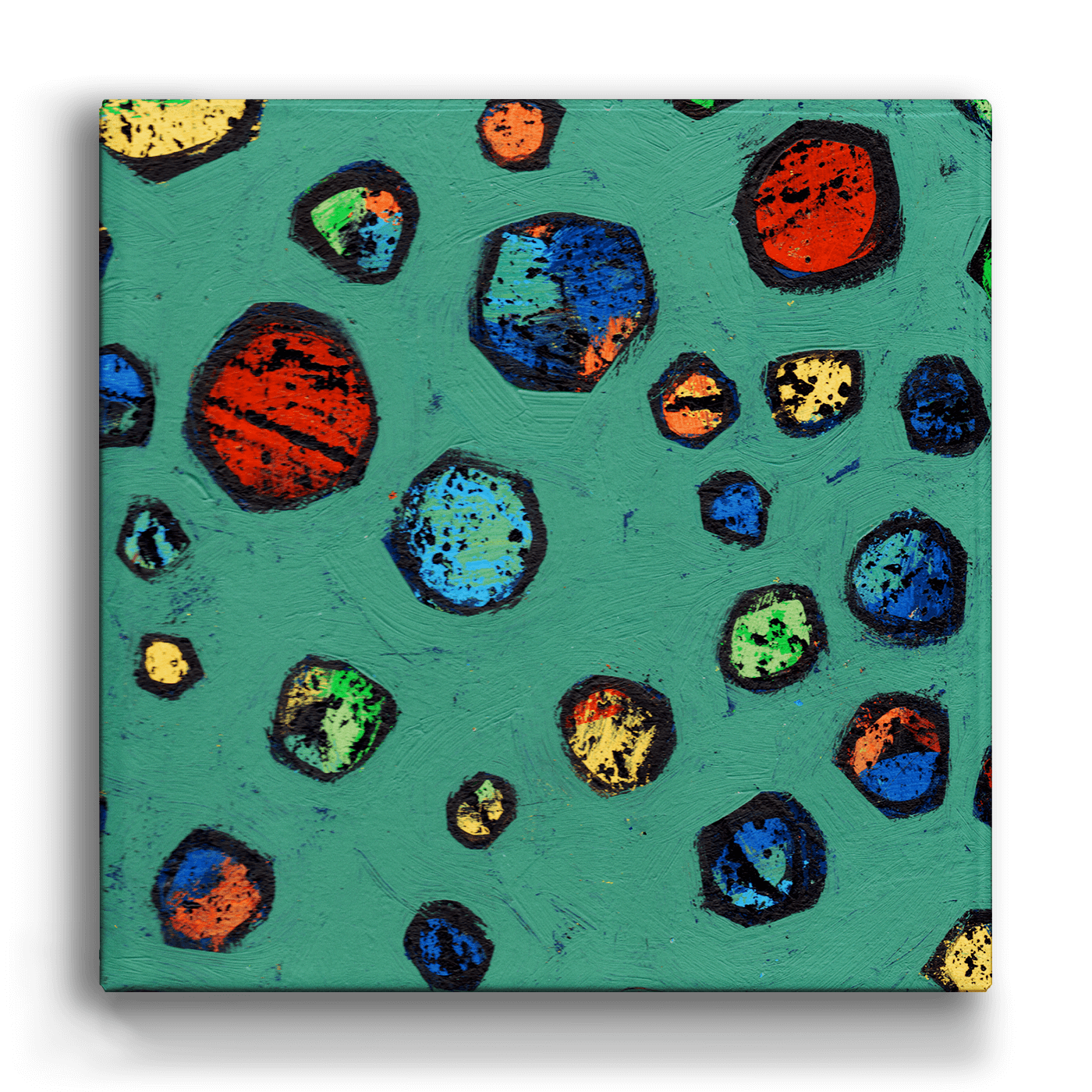 This playful and vibrant artwork features a dynamic array of colorful marbles scattered across a bold green background. The rich textures and striking hues of red, blue, yellow, and green create a lively composition full of energy and charm. Perfect for sparking nostalgia or adding a pop of color, this piece captures the simple joy of childhood games and creativity.