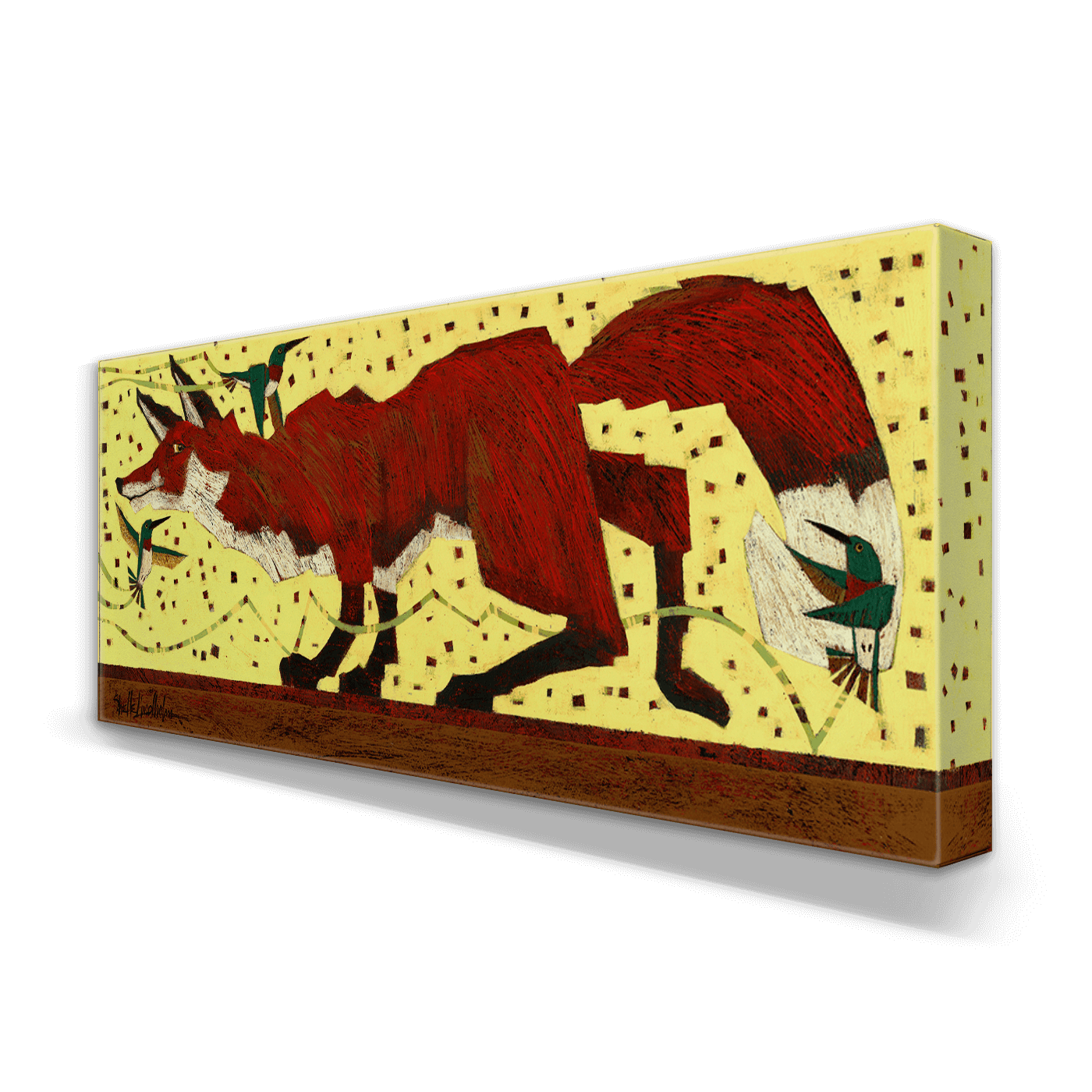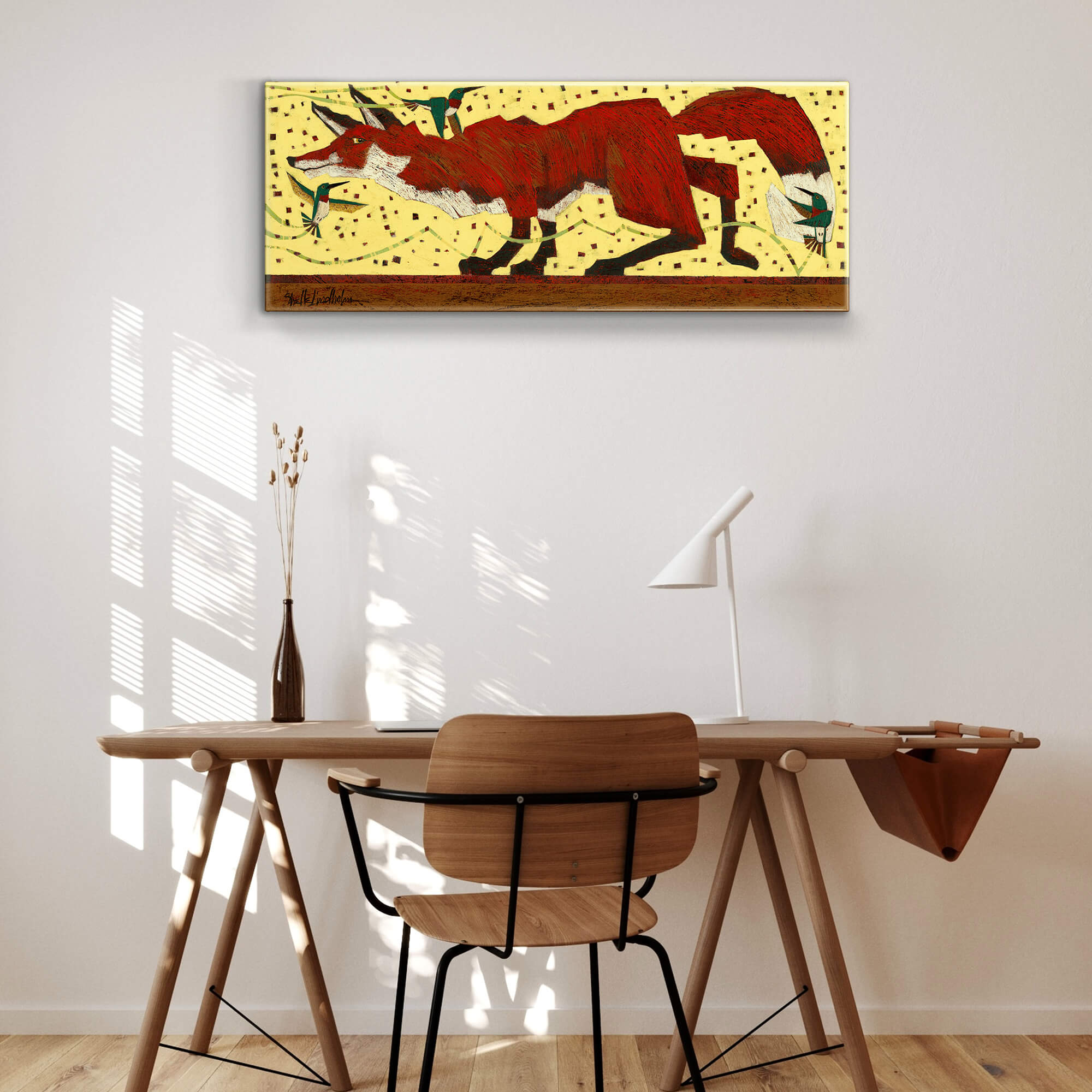 Add a touch of the wild to your space with Zoom Meeting, a vibrant artwork showcasing a sleek, stylized fox in motion, surrounded by delicate hummingbirds. With bold colors and dynamic patterns, this piece captures the energy and grace of nature’s most cunning predator. Perfect for wildlife enthusiasts and art lovers, this unique design brings life and movement to any room.