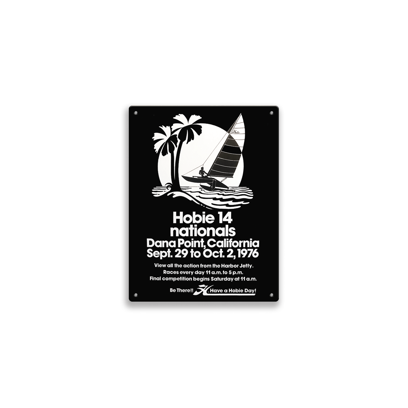 This vintage artwork commemorates the Hobie 14 Nationals held in Dana Point, California, in 1976—a defining moment in Hobie sailing history. Featuring bold black-and-white graphics with a palm-framed catamaran and era-authentic typography, it captures the laid-back energy and competitive spirit of the event. As part of the 75th anniversary collection, this special edition tin tacker is a perfect throwback for sailing fans, vintage sport collectors, or anyone who appreciates the roots of Hobie’s coastal legacy.